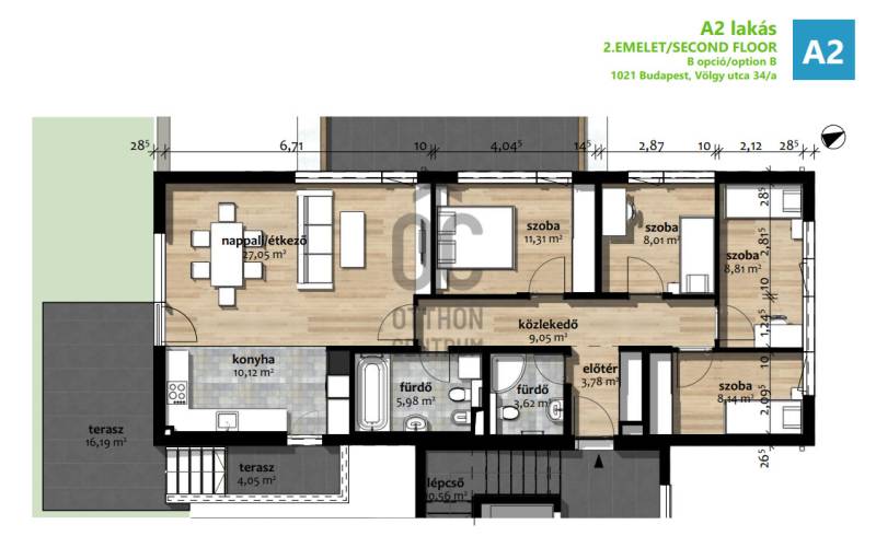 KÉPZELD EL…..Képzeld el álmaid otthonát, azt a lakást, amiben nincs kompromisszum, minden a kényelmedet és kikapcsolódásodat szolgálja. A helyet, ahová élmény megérkezni, ahol csend, nyugalom zöldellő növények között olyan épület áll, amely eleganciát, harmóniát és biztonságot sugároz.Ez az új otthonod, ma még project, mégis több mint ígéret, több, mert építése elkezdődött! VÖLGY GARDEN….A HELY: Hűvösvölgy egyik legkedveltebb utcája, korlátozott autós forgalommal, a villamos pályatest modernizálták, a megállókat felújították. 2150 m2-es telken két épületben, öt lakás eladó,( kettő már gazdára talált ) 3 – 4 – 5 szobás lakás változatok. Saját kertrész /338 m2/ saját garázs 19m2, vásárlási opcióval 12millió ft/db saját tároló, 5-8 m2-es vásárlási opcióval 1,2millióFt/m2SZERKEZETI TECHNOLÓGIA: C.L.T CROSS LAMINATED TIMBERHossz és keresztirányban rétegenként ragasztva, nagy szilárdságú fenyődeszkákból készítik a falakat, födémeket és a tetőt. Az építés során gondosan ügyelnek arra, hogy fenntartható forrásból származó és magas minőségű építőanyagokat használva, alacsony karbon lábnyomot hagyjanak, minimális hulladék képződés mellett precízen, gyors ütemben építik fel a lakóépületet.A fa az emberiség egyik legrégibb építőanyaga, az építészet fejlődésévelúj és újabb technológiák születtek változó költség, élettartam és minőségben.Ausztriában már a 90-es évek óta használják, a Távol-Keleten is népszerű építési módszer: földrengés, tűz és viharbiztos. MŰSZAKI LEÍRÁS: Födém-tetőszerkezet - kiváló hő-hangszigetelt földrengés-tűz (DS\'1) - viharbiztos időjárási viszonyoknak nem kitett duzzadás és penész mentesek garantált, magas élettartam (min.80év) Épület - párakezelés /allergén/vírus védelem /gépi szellőztetéssel/ alacsonyabb épület üzemeltetési költségek Épület automatika OKOS OTTHON Szigetelés 25 cm Szerkezetkész állapot : 2024 október-novemberFűtés Hőszivattyú hűtés-fűtés, padlófűtés konyhában és a fürdőkben elektromos padló temperálásENERGETIKAI tanúsítvány: „B”Szerkezetkész állapot : 2024.novemberA KÖRNYÉK: Hármashatárhegy és a Jánoshegy séta távolságra A Völgy utcában limitált a gépjármű forgalom A készülő épület kerékpárral is megközelíthető. A mikro-makro környezet intézményi -vásárlási-ügyintézési szempontból is maximálisan ellátott. A beruházó cég: 30 éve foglalkozik ingatlanfejlesztéssel és értékesítéssel. Kivitelezési épületeik között az exkluzív villától, a kis lakás számú társasház, több száz lakásos lakópark megtalálható.A2 LAKÁS „B opció” Nappali + 4 szoba II.emelet. alapterület: 96,54 m2 komfort: dupla komfort tájolás: D Terasz: 20,24 m2 Saját kertrész: 338m2