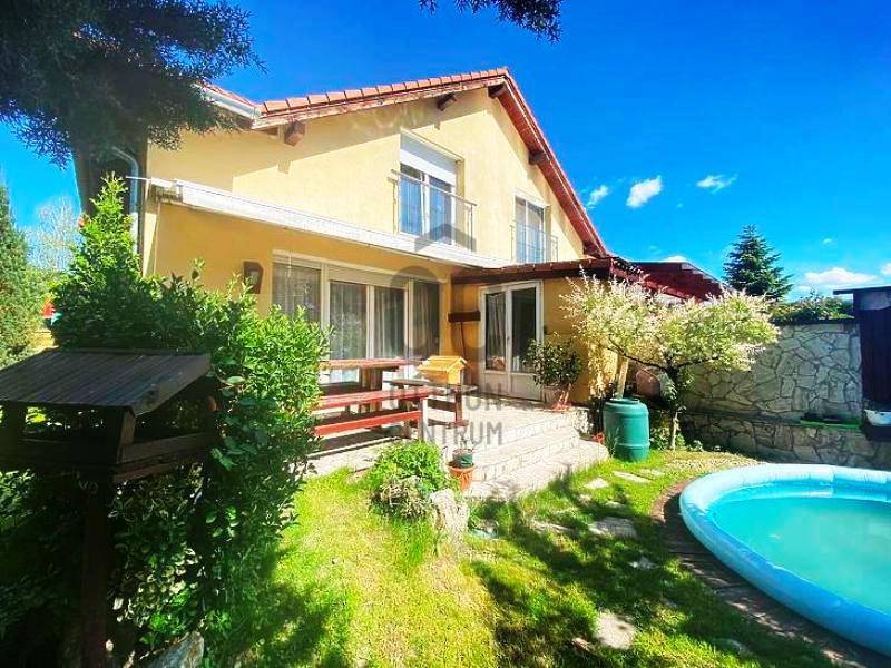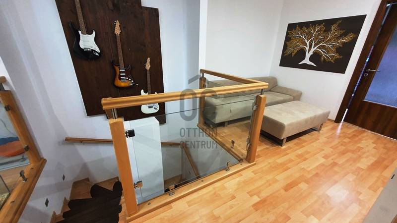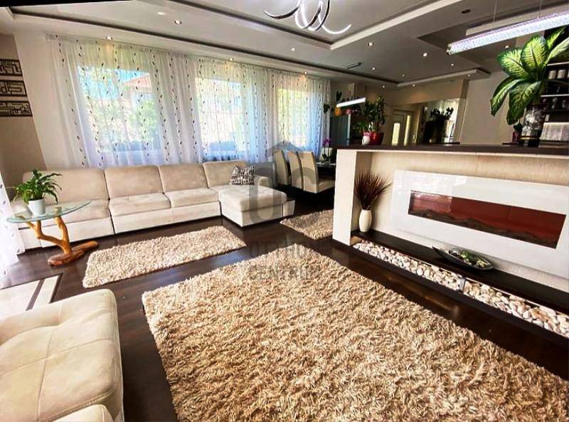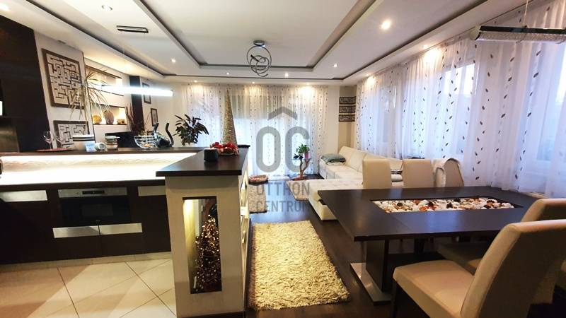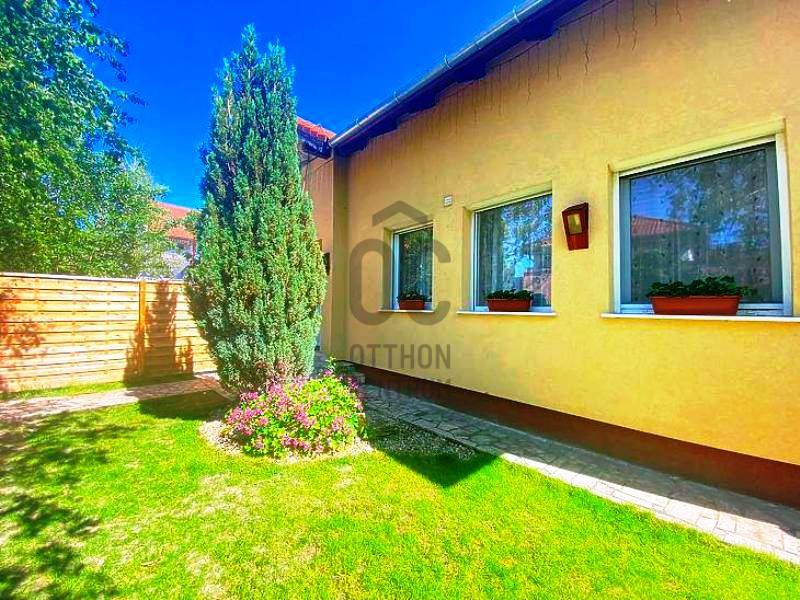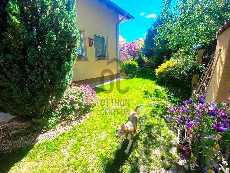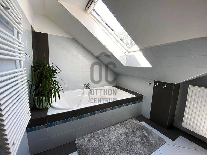 Dunakeszi Duna-parthoz és a központhoz közeli, mégis csendes, forgalomtól mentes utcájában, 2 generációs (és akár 3 generációssá alakítható!), kitűnő állapotú, modern, stílusos, sok extrával felszerelt ikerház fél eladó.A ház 380 m2-es telken áll, jelenleg 2 lakrészből áll, összesen bruttó 165 m2, 6 szobával, dupla komforttal és egy 17 m2-es fedett terasszal rendelkezik. Világos, kellemes, otthonos, élhető terei úgy kapcsolódnak, hogy akár egy harmadik generáció szeparált lakhatása is kialakítható, vagy egy egyszerű összenyitással egy nagy családi házzá (vissza)alakítható. A ház 2006-ban épült, 38-as Porotherm téglából, és 10 cm-es dryvit, szigetelést kapott, Bramac cseréppel fedett, hő és hangszigetelt nyílászárókkal, redőnyökkel és szúnyoghálóval felszerelt. Klimatizálás, riasztó és elektromos kandalló is van.A padlástérben egy 30 m2-es rész még szabadon alakítható.Téli teljes rezsiköltsége 46 000 Ft.A kert parkosított, öntözőrendszerrel ellátott. Itt kapott helyet egy medence és van továbbá egy kerti tó, és egy fúrt kút is, valamint egy 6 és egy 12 m2-es tároló.Jelenleg 2 db autóbeállási lehetőség van, egy fedett és egy fedetlen. (A 2 generációssá alakításkor a garázsból lakrész lett, amit egy egyesítés után vissza lehet állítani.Közlekedése, ellátottsága kiváló, tanintézmények, vásárlási lehetőségek és szolgáltatások, a Duna-part, buszmegálló percek alatt elérhető.Az összes beépített bútor és egyéb berendezés a vételár részét képezi, a többi bútor megegyezés tárgya lehet.Kérdéseivel keressen bizalommal akár hétvégén is! Időpont egyeztetés legalább az előző napon szükséges.