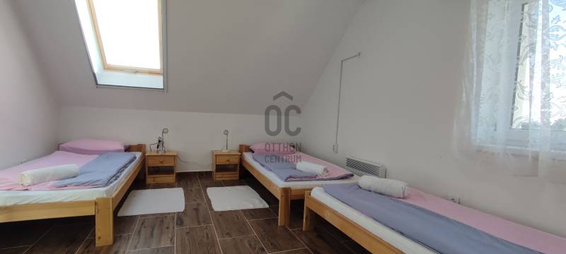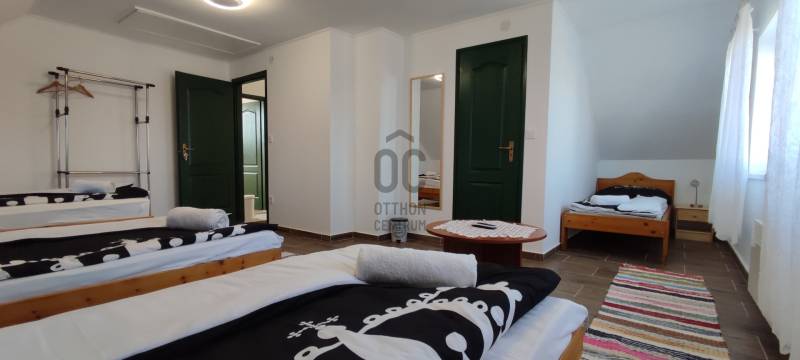 A ház tökéletes elhelyezkedése és minőségi kialakítása teszi figyelemreméltóvá a jelenlegi ingatlanpiacon. Nagy társaságok fogadására alkalmas, 3 szint áll rendelkezésre. A földszinten 2 nagy szoba + fürdőszoba, nagy konyhával és étkezővel. Az emeleten 3 szoba fürdőszobákkal. A legnagyobb közösségi teret pedig az egész ház alatti szuterén pincerész szolgáltatja, gyakorlatilag akár kispályás focitornát is lehet tartani :), annyira hatalmas a pince.Minden közmű bekötve, a gáz a telken belül, mivel a fűtést és a hűtést elektromos fűtőpanelek és klímák látják el. Az udvaron déli fekvésű 10 kW-os napelemrendszer került telepítésre. Ezzel azt érték el , hogy egy igazi \"passzív\" jellegű apartmanházat lehet üzemeltetni, természetesen éves szaldós elszámolással. Ennek a rendszernek a minimális éves termelése kb.: 13.000 kW.Ha valaki tovább szeretné építeni az álmát és a vendégek befogadószámát, jelzem közvetlen a szomszédban konyhával, jacuzzival és szaunával rendelkező 7 szobás, 17 személy elszállásolására alkalmas panzió is piacra került.Ha felkeltettem érdeklődését, vagy kérdése lenne az ingatlannal kapcsolatban, forduljon hozzánk bizalommal!Díjmentes jogi szolgáltatásokkal és ingyenes bank független hitelközvetítéssel állunk vevőink rendelkezésére!Hétvégén értékesítési ügyeletet tartunk!