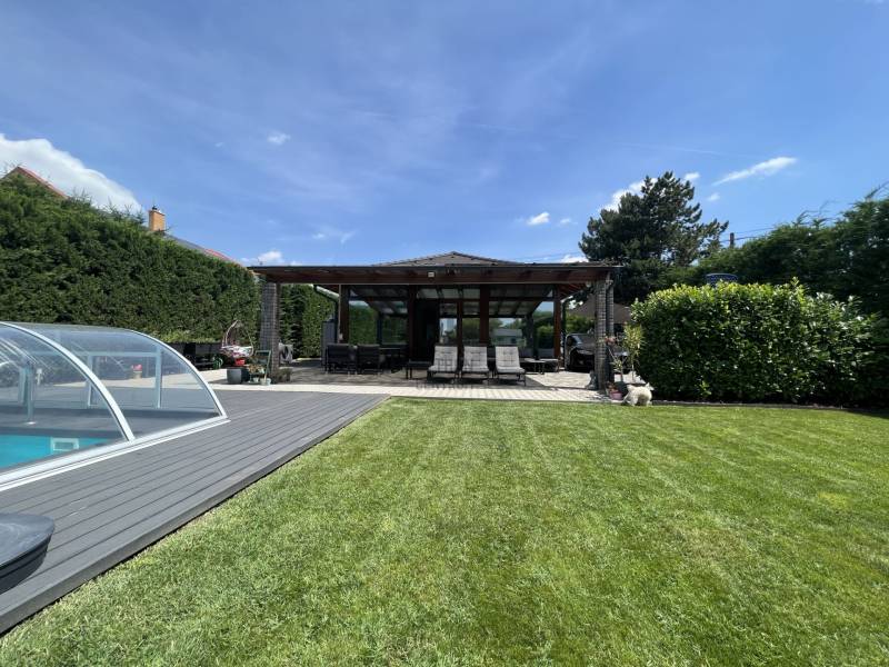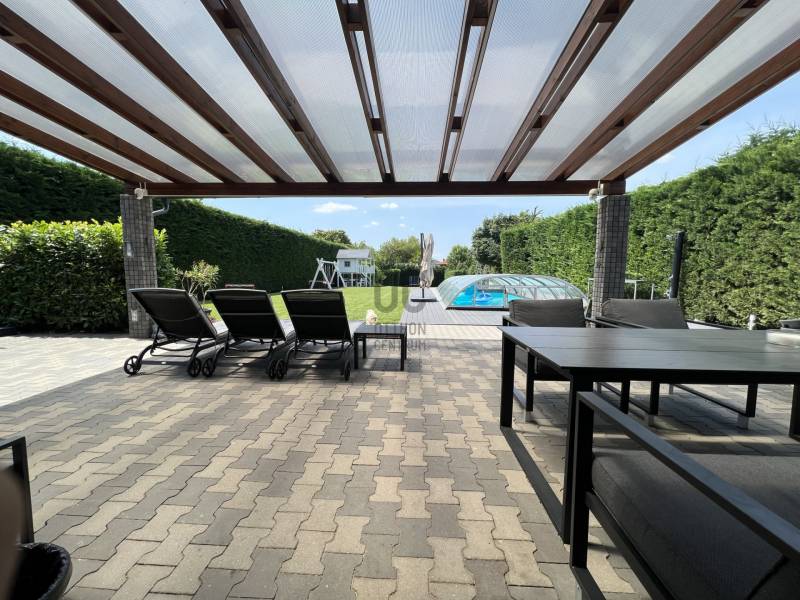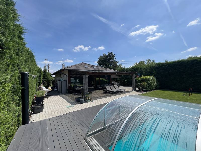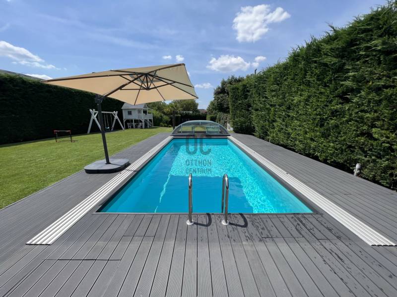 XVI. kerületben eladóvá vált egy önálló, nagy telekkel rendelkező felújított SZOLID LUXUS kivitelben megépített családi ház!Ismerje meg főbb jellemzőit:- kb 1980-ban épült- nettó 94,7 nm-es - bruttó 115,19 nm-es - 40,77 nm-es terasszal rendelkezik, melynek a fele beszámítódott a nettó területbe- 1839 nm telek tartozik hozzá- nappali + 2 szobásMűszaki jellemző:- 2019-ben teljes körű felújítás történt- falazata: tégla- tetőcsere: 2018-as év- héjazat: Bramac antracit betoncserép- fűtése: gázcirkó- villanyhálózat: réz, 3x32A- új beltéri ajtók- új műanyag nyílászárók, redőnyösek, szúnyoghálósok- nappaliban új fa nyílászárók- új hideg-, meleg burkolatok- Dryvit szigetelés 10 cm-esExtrák:- 17 db 5,6 kw-os napelem- klimatizált- konyhabútor a vételár részét képezi- riasztó távfelügyelettel- kamera rendszer- fedett medence 8,5x3,5 m- applikációval működik: riasztó, medence, kültéri világítás- elektromos autó töltőkKültér és kert: - térkövezett- elektromos tolókapu- gondozott intim kert- mini játszótérKözlekedés:- 600 m-re található 45, 92, 92A, 908 buszok (6-7 perc gyalogosan)- 850 m-re H8-as hév- M0-ás pár perc autóvalAmennyiben fontos önnek:- a nagy és intim kert- nem akar felújítással foglalkozni- minimális fenntartású házban akar élni- illetve hozzá építeneAkkor ne is menjen tovább, hiszen megtalálta álmai ingatlanját!Kérdése van? Hívjon bizalommal!