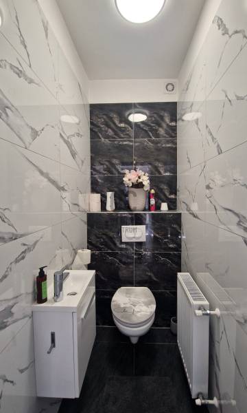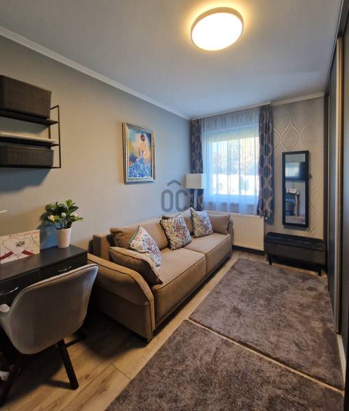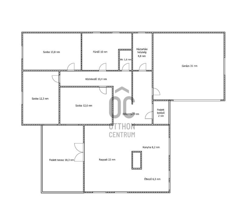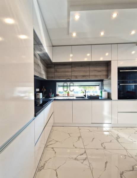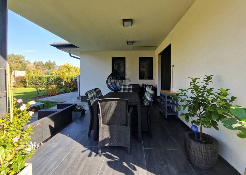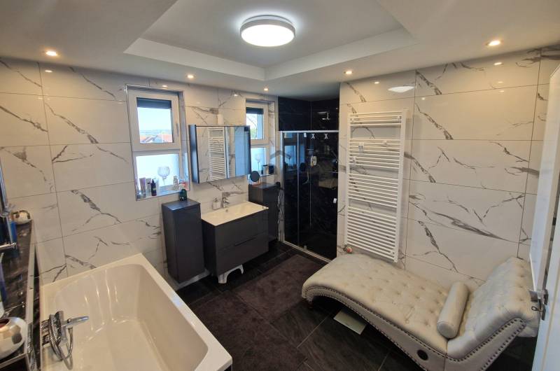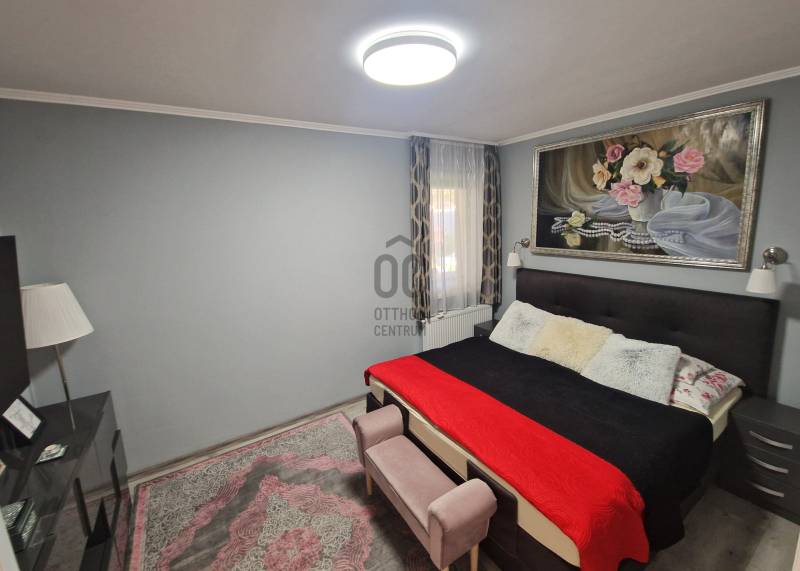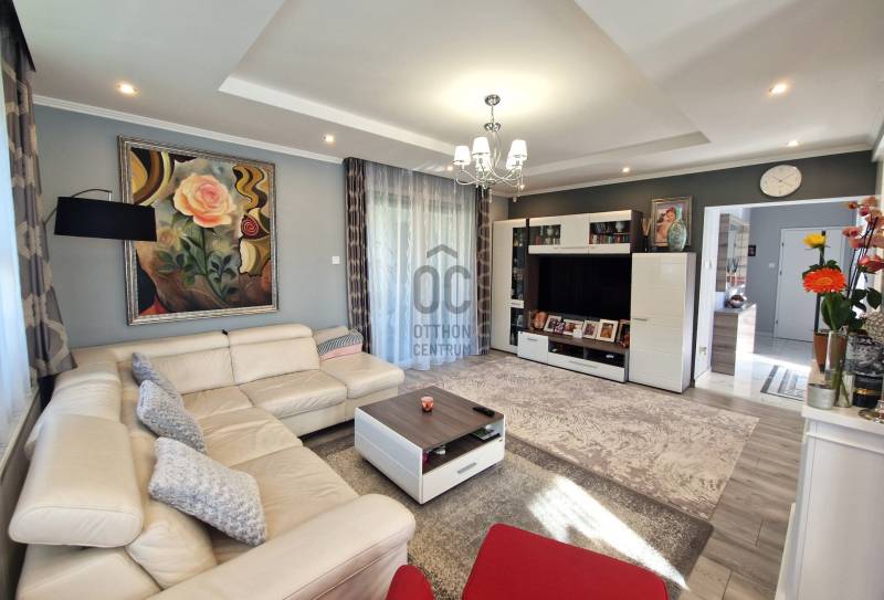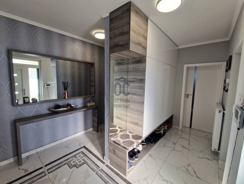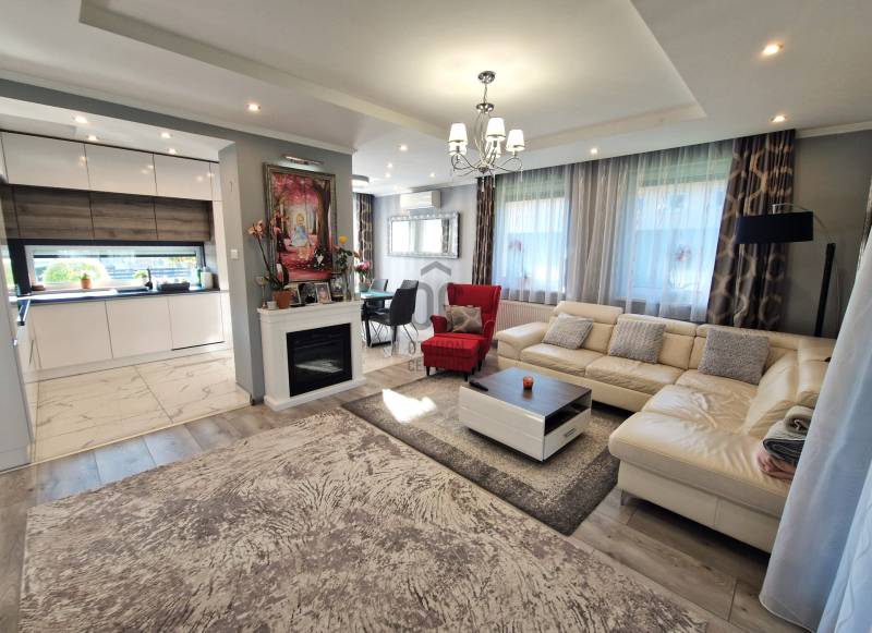 Eladó Erdőkertes Háromház városrészében új építésű házak környezetében egy újszerű, modern, 2020-ban - egyedi tervek alapján, magas műszaki tartalommal, és minőségi anyagokkal - épült, 155 nm-es, földszintes 4 szobás önálló családi ház. Elosztása három normál méretű szobát, beépített szekrénnyel rendelkező előszobát, tágas, a 20 nm-es fedett terasszal kapcsolatos nappalit, gépesített konyhát, étkezőt, háztartási helyiséget, külön wc-t, káddal és zuhanyzóval is rendelkező nagy fürdőszobát és egy dupla állásos, közvetlen előszoba kapcsolatos fűtött, gumi parkolási ütközővel is ellátott garázst foglal magába. A 12 cm-es külső és 20 cm-es mennyezeti szigeteléssel ellátott épületet, telefonnal vezérelhető termosztáttal ellátott Immergas kondenzácíós gázkészülék fűti, radiátoros központi rendszeren keresztül. Az ingatlan esztétikai és műszaki tartalmát gazdagítják egyedi kivitelezési megoldásai, számtalan intelligens extrával - Somfy IO intelligens otthon - is kiegészülve, melyek a teljesség igénye nélkül a következők: Alumínium színezett csatornarendszer, riasztó rendszer mozgásérzékelőkkel és kamerarendszerrel, Honeywell típusú vízszűrő, három rétegű kívülről színes, szúnyoghálóval és alumínium színezett külső párkányokkal is ellátott műanyag nyílászárók, egyedi porta beltéri nyílászárók, AH típusú kívülről színezett biztonsági bejárati ajtó, alumínium színezett redőnyök telefonról vezérelhető motormozgatással, kívülről színezett Rimessa dupla garázskapu mely szintén telefonról vezérelhető, ahogyan a kétszárnyú kertkapu és a 3,5 kw-os Hitachi inverteres split klima is. Az áramellátást 3*16 A biztosítja, 7,5 kw-os napelemrendszer áll rendelkezésre, például a garázsban elhelyezett 3 fázisú Wallbe elektromos autótöltő, és nappaliban található elektromos kandalló üzemeltetésére. A 834 nm-es telek, a több autó beállását is biztosító térkövezett felületen és egy 9 nm-es tárolón túl, parkosított udvarral rendelkezik, melyet robot fűnyíró és wifiről vezérelhető, locsoló almérőre kötött autómata öntözőrendszer segít karban tartani. Az ingatlan tehermentes, jogilag rendezett, várja minőségi és kényelemes otthonra vágyó új lakóit.Ha felkeltettem érdeklődését, várom hívását!