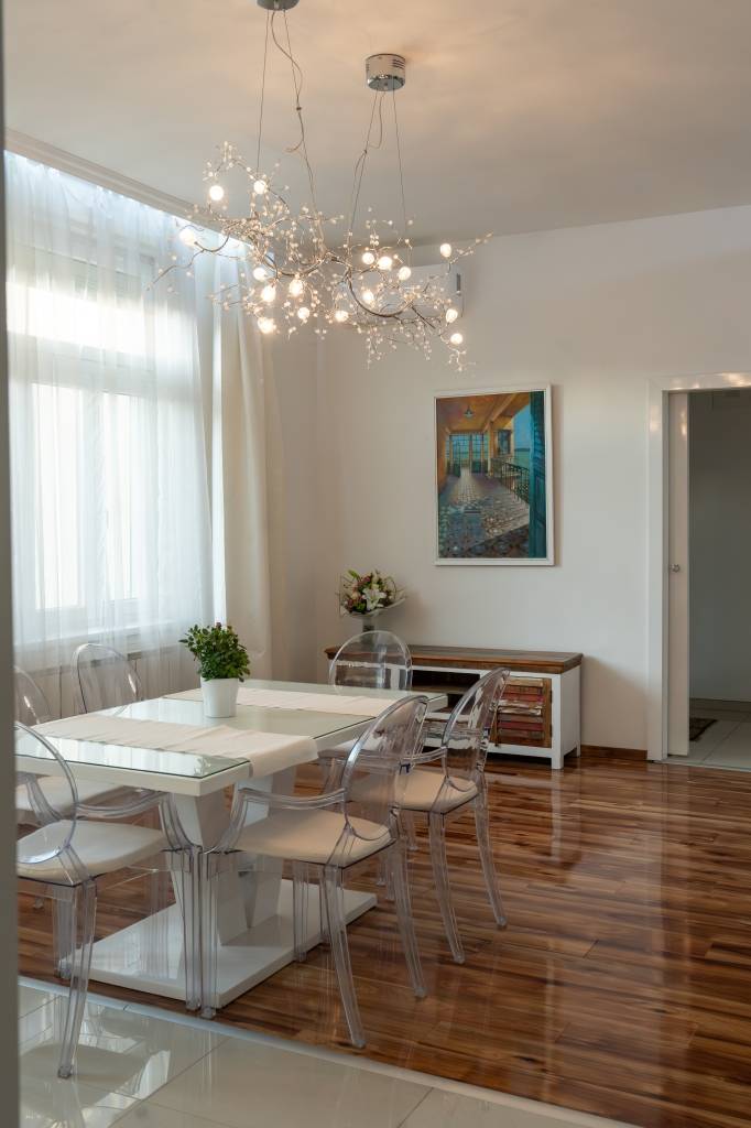 Eladó egyedi luxuslakás Újlipótváros szívében tetőterasszal!Ha valami igazán különlegesre vágyik, ne keressen tovább! A XIII. kerületben, a Hegedűs Gyula utcában kínálom megvételre ezt az egyedi megoldásokkal kialakított, 161 nm-es, 5. emeleti luxuslakást.A 4 szobás ingatlan különlegessége a saját belső személyi lift, amely közvetlenül a privát infraszaunához és a Budai panorámás tetőteraszhoz vezet. A lakás főbb jellemzői:A társasház kiváló állapotú mindössze 50 lakás van benne. Exkluzív és biztonságos környezet: Az 5. emeleten mindössze két lakás található, a lift pedig csak kulccsal használható, így a privát szféra teljesen biztosított. A lakás távfelügyeletre kötött riasztó rendszerrel rendelkezik.Modern technológia és kényelem: 2024-ben új Vaillant kazán és minden helyiségben hűtő-fűtő inverteres klíma került beszerelésre. Radiátorok és fan coil van.A tető új szigetelést kapott illetve műfüvesítve lett.Prémium minőségű felújítás 2015-ben. Az összes villanyvezeték, vízvezeték, a fal hanggátló belső szigetelést kapott, új műanyag nyílászárókat, szúnyogháló és redőny.A legmodernebb anyagok és egyedi design jellemzi a lakást, ahol a magasfényű modern bútorok és vintage stílus tökéletes harmóniát alkotnak.Kiváló hő- és hangszigetelés: A lakás télen kellemesen meleg, nyáron pedig hűvös marad, így energiahatékony és komfortos.Teljesen berendezett: Az ár tartalmazza az összes egyedi gyártású és gondosan válogatott bútort és teljes gépesített konyhát.Elrendezés:Tágas előszoba, amely az étkezőbe vezet, ahol egy látványos kiszolgáló pult található.Nyitott nappali, amelyet egy elegáns oszlop választ el az étkezőtől. Óriási terek és a nagy belmagasság egyedi hangulatú!Teljesen gépesített szinte új állapotú rejtett konyha az étkező mellett.Gardróbhelyiségből nyíló fürdőszoba, amely zuhanyzóval, WC-vel és bidével felszerelt.Mosókonyha és kazánház.Különálló szoba, amely ideális lehet dolgozó szobának vagy vendég szobának.Az ingatlan éke amitől garantáltan el áll a lélegzete....a szint eltolással kialakított, 5 méteres belmagasságú hálószoba aminek a tetején ablakok vannak így akár ágyból is láthatjuk a csillagos eget vagy ébredhetünk arra,hogy a hasunkra süt a nap!Elektromos redőnnyel ellátott tetőablakok biztosítják a kényelmet.Egy exkluzív kétszemélyes pezsgőfürdős kád és épített üveg zuhanyzó is helyet kapott egy légtérben. Illetve a márvány mosdó ahol a vizcsap nyitására felkapcsol a lámpa! Külön zárt helyiségben van egy wc és bide is.Ebből a különleges hangulatú hálószobából belső személyi lift visz fel az infraszaunához. Innen néhány lépcsővel elérhető a fából kialakított tetőterasz csodás panorámával. Tűzijáték páratlan élményt nyújt innen! Extrák:-Központi porszívó-Egyedi világítási rendszerek-Étkezőben zöldfal-Teljesen rejtett vezetékek és csövek- RiasztórendszerElhelyezkedés és közlekedés:A lakás Újlipótváros egyik legkedveltebb részén található, ahol kiváló infrastrukturális adottságok és remek közlekedési lehetőségek várják:M3 metró (Lehel tér vagy Nyugati pályaudvar megálló) pár perc sétára,4-6-os villamos a körúton gyors elérést biztosít a város más részeihez,Számos busz- és trolijárat is könnyen elérhető.Látnivalók és kikapcsolódási lehetőségek a közelben:Szent István park – tökéletes hely egy kis pihenésre, sétára vagy sportolásra.Margitsziget – Budapest egyik legszebb zöld szigete csupán egy rövid sétára.Westend Bevásárlóközpont – számos üzlet, étterem és mozi a közelben.Duna-parti sétány – romantikus esti sétákhoz vagy futáshoz ideális.Befektetésnek is kiváló garantáltam kiadható hosszú vagy akár rövid távra is magas áron!Ez a különleges luxuslakás kizárólag az én kínálatomban érhető el!Megtekintés rugalmasan, akár azonnal!Ha felkeltette az érdeklődését, hívjon bizalommal, ha nem veszem fel, visszahívom!I.V.