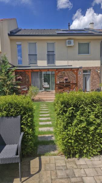 Debrecen kedvelt részén, a Hatvan utcai kert csendes, új építésű övezetében, magas műszaki tartalommal rendelkező, jó elrendezésű, kétszintes láncház eladó. Az ingatlan, nappali + 3szobás, dupla komfortú, a földszinten garázzsal, terasszal, és önálló kertkapcsolattal. Az ingatlan főbb jellemzői:-élhető tágas terek, kitűnő tájolás, nagy üvegfelületek-a szomszédtól független épületszerkezet, önálló épület-saját tulajdonú, sorompóval elzárt magánút-nagy terasz-nappali+3szoba!-K-Ny tájolás, kiváló benapozás-prémium minőségű nyílászárók-15cm szigetelés-cirkó-fűtés, kondenzációs kazánnal-fal, padló, és a mennyezet hűtés-fűtés-3,5 kw-os napelem-minőségi burkolatok és szaniterek-központi porszívó-a konyha gépészete 2 éve cserélve-ház előtt 4állásos magánparkoló-automata öntöző rendszer-kitűnő infrastruktúra-csendes, értékálló környezetés még rengeteg más...Kiváló lokáció, jó tömegközlekedés, a belváros kerékpárúton is mindössze pár perc. A közelben hipermarketek(Lidl, Auchan, Tesco, Stop Shop), iskolák, óvodák, orvosi rendelők, gyógyszertárak , játszóterek és a leendő BMW-gyár találhatóakJózsai, vagy Pallagi, vagy debreceni zárt beépítéses 110-130 nm2-es házra cserélhető ráfizetéssel, de csakis csendes környéken!
