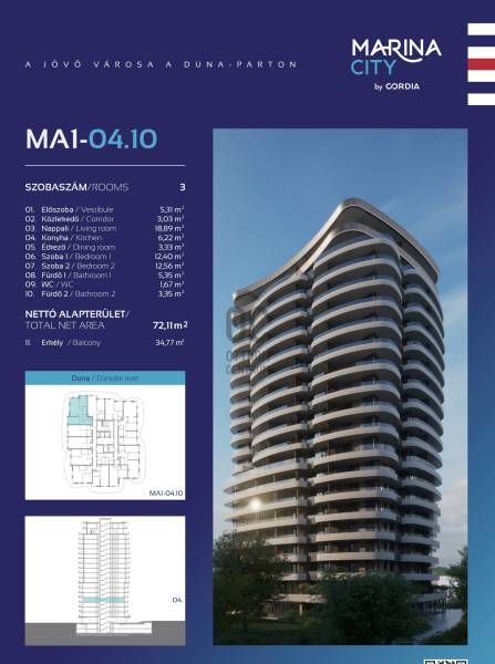 A Marina City A1 lakópark a budapesti XIII. kerületben, közvetlenül a Duna-parton található, és a Cordia fejlesztésében valósul meg. Ez a projekt egy 14 hektáros területen épül, amelyet korábban ipari célokra használtak, és most egy modern, zöld városnegyeddé alakul át.AZ INGATLAN JELLEMZŐI-szobák száma 3-ingatlan mérete 73.11nm+34.77nm erkély-Dunára Budai-hegyekre panorámás-ÉNY-i tájolású-mennyezeti fűtés és hűtés-okosotthon-5. emeleti-1 db tároló kötelezően megvásárolandó-1 db gépkocsi beálló kötelezően megvásárolandó-várható átadás 20267 első negyedév-rozsdaövezeti besorolás, 5% áfa visszaigényelhető-fizetési ütemezés: a szerződéskötéskor a teljes vételár minimum 25 %-a, a fennmaradó vételár részlet kifizetése megegyezés szerint a birtokbaadásig történikAz ingatlanhoz tartozik 1 db tároló és 1 db gépkocsi beálló, ezek megvásárlása kötelező, a hirdetési ár ezek árát nem tartalmazza.A tároló ára 4.000.000. Ft. a gépkocsibeálló ára 11.000.000. Ft.FŐBB JELLEMZŐK•Elhelyezkedés: A lakópark az Újpesti-öböl partján helyezkedik el, 1,2 km hosszú közvetlen vízparttal, és lenyűgöző panorámát kínál a Dunára és a Budai-hegyekre.•Zöldterületek: A projekt részeként 90 000 m² parkosított, autómentes zöldterület kerül kialakításra, amely játszótereket, kutyafuttatót, szabadtéri edzőparkot és kerékpárutakat foglal magában.•Építészeti tervezés: A Dyer Group által tervezett A1, A2 és A3 lakótornyok organikus formavilágúak, lekerekített, szirom-szerű erkélylemezekkel, amelyek egyedi megjelenést kölcsönöznek az épületeknek.•Energiahatékonyság: Az épületek kiváló energiahatékonysággal rendelkeznek, A+ besorolást kaptak.•Közlekedés és infrastruktúra: A lakópark kiváló közlekedési kapcsolatokkal rendelkezik, mind autóval, mind tömegközlekedéssel könnyen megközelíthető. A Váci út mindössze 150 méterre található, és a Duna Plaza bevásárlóközpont is a közelben van.•Lakások: A projekt során több mint 2500 lakás épül, amelyek közül sok örökpanorámás kilátással rendelkezik a Dunára és a Budai-hegyekre.A Marina City A1 lakópark ideális választás lehet azok számára, akik modern, zöld környezetben, kiváló infrastruktúrával rendelkező otthont keresnek Budapest szívében.Ebben az épületben az utolsó lakások egyikét kínálom megvételre, további információkért keressen bizalommal!