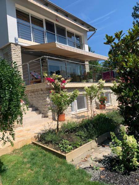 2021-ben teljes körűen felújított, modern tervezésű, 2 szintes plusz szuterénes, 949 négyzetméteres telekkel rendelkező lakóingatlant kínálunk megvételre.Az épület egy napfényes szuterén szintből, egy emeletből és egy tetőtérből áll.A külön bejáratú, kertkapcsolatos szuterénben mosókonyhával összekötött fürdőszoba+wc, valamint egy nappali található.A földszinten fürdőszoba+wc, egy amerikai konyha és nappali, valamint egy gardrób helyiség is található. Ehhez a részhez kapcsolódik egy balatoni panorámával rendelkező terasz.A felső emelet egy dolgozósarokból, egy nappali és hálószoba részből áll, amelyhez külön gardrób és fürdőszoba+wc csatlakozik. Ez a szint is Balatonra néző panorámával nyújt csodaszép látványt az év minden szakában.A ház fűtése Vaillant kombi gázkazánnal történik, ezt egészíti ki a földszinten egy működőképes kandalló is.Emellett minden szinten beszerelésre került 1-1 hűtésre-fűtésre alkalmas légkondícionáló berendezés.A kertben egy fedett kocsibeálló, valamint több autó parkolására alkalmas viacolor térkővel kirakott kocsibehajtó található.A ház mellett egy teljesen felszerelt, gépesített nyári konyha, egy kerti zuhanyzó, bográcsozó-grillező és egy tároló kamra helyezkedik el.A télen-nyáron zöldellő kertben fúrt kút és locsolórendszer van kiépítve. A ház bejáratain és ablakain szúnyoghálók, elektromos redőnyök, sötétítők, a terasz és tetőtér ablakai felett napellenzők vannak. Az épület riasztórendszerrel felszerelt. A 71-es főútról nyílik az elektromos kapu. A kert több mint 100 féle növénnyel beültetett, a mediterrán növények, a ritka fák, a veteményes- és a fűszerkert gondosan ápolt és kertészekkel karbantartott.Amennyiben kérdése merülne fel az ingatlannal kapcsolatban, vagy szertené azt megtekinteni, várom megkeresését elérhetőségeim egyikén!