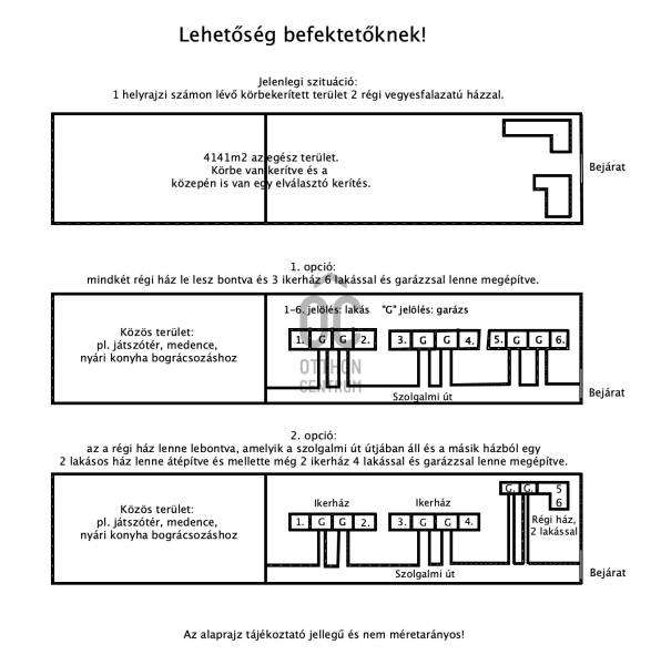 4141m2 nagy telek eladó 2 felújítandó családi házzal Ráckeresztúr központjában. BEFEKTETÉSI LEHETŐSÉGKÉNT IS IDEÁLIS, MERT 3 IKERHÁZ, ILLETVE 6 LAKÁS ÉPÍTHETŐ RÁ, MIVEL A TELEK EGY HELYRAJZI SZÁMMÁ LETT ÖSSZEVONVA. A két meglévő házat lebontatni és 3 ikerházat ill. 6 lakást vagy sorházakat és egy szolgalmi utat létrehozni (lássa első alaprajzot), hátul közösségi telekrésszel (pl. játszótér, medence, bográcsozó, nyári konyha, jacuzzi, zöldséges és fűszeres kert, stb.). A tulajdonos ÉPÍTŐIPARI VÁLLALKOZÓ, ÍGY AKÁR MINDEZT Ő IS MINDEZT MEGVALÓSÍTHATJA ÖNNEK. TERMÉSZETESEN EBBEN AZ ESETBEN ÉPÍTKEZÉSI TERVRAJZOKKAL FELÁR ESETÉN.- Jelenleg egy 80 nm-es és 110 nm-es felújítandó vegyes falazatú, összközművesített, 5 szobás, földszintes, cserép fedésű ház áll a telken- TISZTA és RENDEZETT UDVAR ÉS TELEK, tulajdonosa MOTIVÁLT- TEHERMENTES ÉS GYORSAN BIRTOKBA VEHETŐBudapest 30 perc, Velence 20 perc és Érd 10 perc autóút.Az M6-os autópálya RÁCKERESZTÚR kivezetőszakasza kb 6 percre van az ingatlantól. Az M6-os és M7-es között fekszik.Jó infrastruktúrával rendelkezik, közelben iskola, óvoda, élelmiszerbolt, posta. Várom megkeresését!