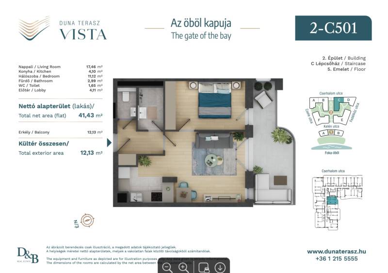 TERVEZETT ÁTADÁS: 2026. DECEMBERA már előrehaladott állapotban épülő, és 2026-ban átadásra kerülő Duna Terasz Vista-ban eladó egy 5. emeleti, D-i tájolású, gondozott belső kertre néző kétszobás, új építésű lakás.A lakáshoz teremgarázs hely és tároló vásárlása opcionális.A 8 és 9 emeletes épületek elkerülhetetlenül vonzzák a tekinteteket! A Vista legkülönlegesebb éke a Duna-partján álló kapu alakzatú épület, amelyben a 6. és 7. emeleten szinte lebegni látszó otthonok alakulnak ki. Az épületpáron körbefutó hullámos erkélyek párbeszédet folytatnak a Foka-öbölben ringatózó hajókkal.Szemünk akadálytalanul halad végig a zöld passzázson a Cserhalom utcától egészen a lélegzetelállító öbölpartig, így nyitva ki a teret a lakók számára a vízpart vagy a csendes pihenőparkok felé.ÖBÖL-PARTI SÁVA Duna Terasz Vista lábánál húzódó öböl-parti terület - átadás után - pihenőpadokkal megszakított lépcsős, füves rézsűvé és part menti sétánnyá alakul, melyről akadálytalanul élvezhető lesz az utánozhatatlan szépségű táj és a hajókikötő egyedülálló atmoszférája.ENERGIAHATÉKONYSÁGA levegő-víz hőszivattyúval kombinált mennyezeti hűtő és fűtő rendszer energiatakarékos működés mellett kiváló hőérzetet is biztosít az AA energiahatékonyságú otthonokban. A kétszintes mélygarázsban e-töltő előkészítésű parkolóhelyek is elérhetőek, ezzel segítve a zöld autózás élményét.XIII. MARINA PART - DUNA TERASZ VISTA LOKÁCIÓA Foka-öböl mélykék, csillámló víztükre, a mindent körbeölelő természet friss illata, a Duna-parti sétány andalgásra csábító térkövei és a lélegzetelállító naplementék megélése Budapest egyik legjobban őrzött titkai közé tartozik. Pár percre a Váci úti irodafolyosótól és a belváros lüktetésétől megszűnik a rohanás és egy nyugodt, csendes, elegáns lakóövezetbe érkezhetünk haza.A Duna Terasz Vista a Cserhalom utca, Csele utca, Fedélköz utca és a Foka-öböl által határolt területre épül, a Duna Terasz Grande és a folyómenti kalandok közvetlen szomszédságába.Várom hívását, keressen bizalommal!