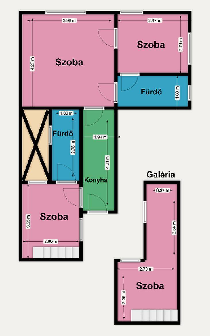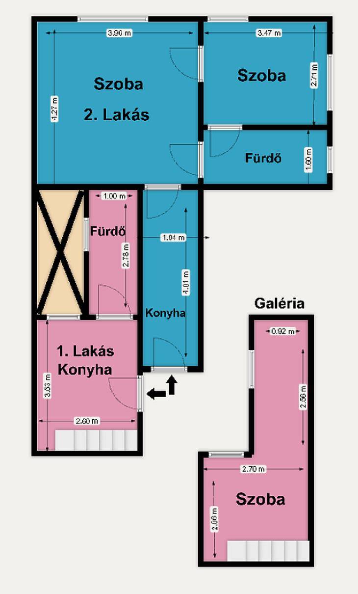 Budapest VIII. kerületében, a Baross utcában, a közkedvelt Corvin-negyedben kínálunk eladásra egy tulajdoni lapon 49 nm-es, belső kétszintes kialakításának köszönhetően azonban 66 nm hasznos területtel rendelkező első emeleti lakást, polgári társasházban.A lakás jelenlegi elosztása rendkívül praktikus: három külön nyíló hálószoba, két fürdőszoba, utcai és udvari nézetű ablakokkal. A 405 cm-es belmagasság lehetővé tette egy galéria kialakítását, ami tovább növeli a hasznos teret.Az ingatlan könnyedén két lakássá alakítható, így ideális lehet befektetőknek is.A fűtés konvektoros, a közös költség kedvező.Kiváló közlekedés és elhelyezkedés: a 4-6-os villamos, a 3-as metró, valamint több buszjárat is pár perc sétára található. A környéken minden megtalálható: boltok, gyógyszertárak, éttermek, kávézók, iskolák, a Corvin Pláza és több egyetem is.Ne hagyja ki ezt a sok lehetőséget rejtő, jól alakítható lakást a belváros közelében – akár saját otthonnak, akár befektetésnek is tökéletes választás!A hirdetés tájékoztató jellegű!