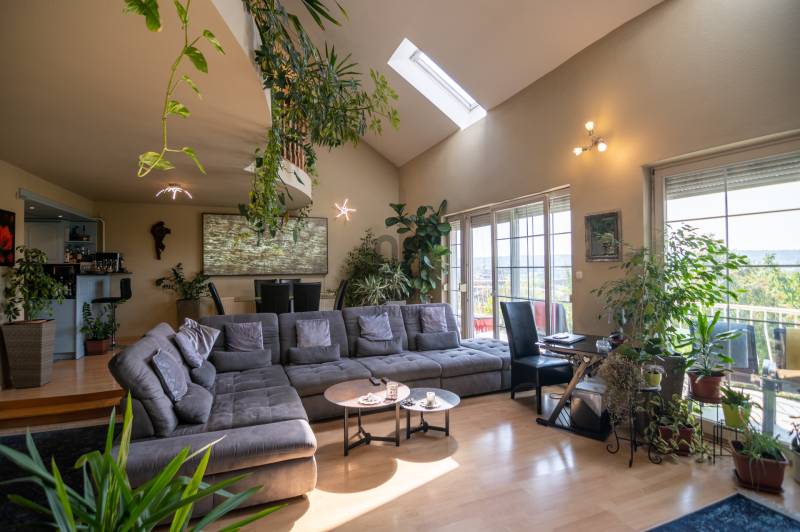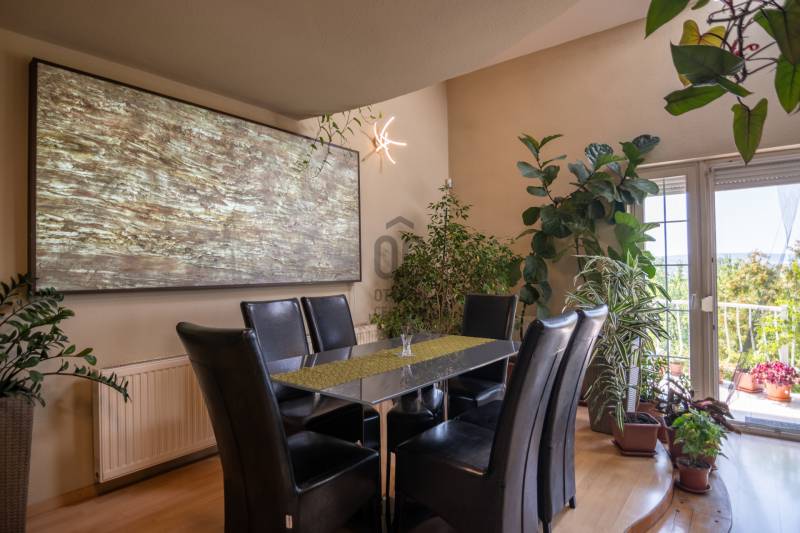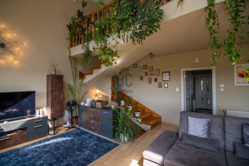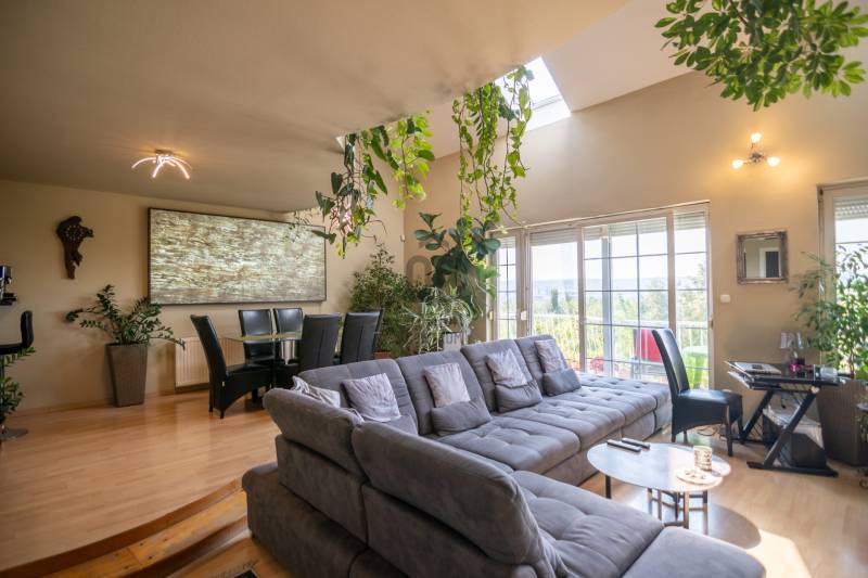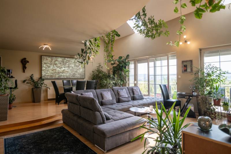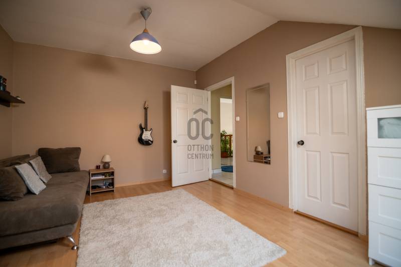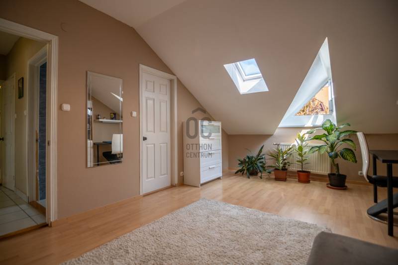 Budaörs-Kertváros egyik legszebb, felújított, forgalomcsökkentett utcájában kínálunk megvételre egy belső négyszintes, panorámás, igényesen megépített sorházat, mely több generáció igényes mégis diszkrét együttélésére is alkalmas.Az ingatlan különlegessége, hogy az utcafront felől nem hivalkodó, tehát nagy mérete egyáltalán nem látható. Dombra épült, így lakóterei a panoráma felé tájoltak. A luxus érzetet fokozza, hogy a nappaliból és a konyhából is panorámás az ingatlan, még a téli időszakban is kellemesen benapozott.FEKVÉSE: K-D-Ny, tehát a nap az ablakok előtt jár egész nap.TERÜLETE:A ház főbb paraméterei között szerepel a nettó 300 nm belső terek: mely 4 lakószintet, 2 nappali + 5 db szobát foglal magába, 2 db konyhát, 2 db kádas-zuhanyzós fördőszobát, 3db wc-t, 2 db teraszt mely összesen: 51m2, és 2 db. panorámás erkélyt: 26m2Mindez kiegészül egy a 369m2 parkosított kertes telekkel.Szintén a ház része egy 18,5m2 fűtött garázs, mely előtt egy kocsibeálló található, a ház előtt két gépjármű számára ingyenes parkoló, 50 méterrel távolabb pedig még 2-3 autó számára parkolási lehetőség.A SZOBÁK SZINTENKÉNTI ELOSZTÁSA:1.Bejárati szint: garázs (18,5m2), előszoba, wc, 5-6m belmagassággal tágas, egybefüggő térben, funkcionálisan elkülönülve a nappali, étkező (50m2) és a konyha, kamra (13m2), erkély: 13m2.2.Galéria-tetőtér szint: 2 hálószoba (16nm, 18nm), fürdőszoba (9m2), közlekedő, wc, nappali (22m2).3.Mínusz 1.szint: közlekedő, gardrób, mosókonyha, fürdőszoba (16,5m2), wc, szoba (19,5m2), szoba (19,5m2), erkély (13m2)4.Kertszint (mínusz 2.szint): közlekedő, tároló, szoba (28m2) konyha (16m2), terasz (41m2)TOVÁBBI FELSZERELTSÉG:A ház a kétezres években épült. Az energetikai besorolása a háznak CC- mely megfelelően modern szigetelést illetve alacsony rezsi költséget jelent a tulajdonosának.Fűtése Unical kombi gázkazán (2020.évben felújítás történt kéménybéleléssel)A dupla kémény miatt lehetőség nyílhat akár a fafűtéses kazán használatára is.Az egész ház fel van szerelve egy modern vezetéknélküli riasztórendszer mely (2019-ben lett beszerelve) zónánként kapcsolható, kisállat mellett is használható, mobilról vezérelhető.A ház padlástere beépített, szigetelt a ház teteje zsindelytető. A háztető újra zsindelyezése folyamatban, a klímabeszerelés is megtörténik az értékesítésig.2025. ÉVI FELÚJÍTÁSOK:- Tető-ultravékony hő- és vizszigetelő folyékony kerámia bevonattal (nanotechnológia)- Homlokzatszínezés - Lézervágott Új kerítés- Belső falak festése- Fürdőszoba (csempe, szaniter) felújításaREZSIKÖLTSÉG:- rendkívül alacsony a következő képpen oszlik meg:-gázfogyasztás: (2022-23) – 1.683m3, kb. 17eft/hó-villany: kb. 11-12eft/ hó-víz-csatorna: kb. 12 eft/2hó-hulladékdíj: 5.800ft/ év – negyedéventeA ház előkertje kb. 20m2 (tuják, bokrok, sziklakert).A hátsó kert kb. 200m2, kb.25 éves nagy cseresznyefa, sziklakert, bokrok, virágok, fügefabokor, néhány tuja, ezek felérnek a 3. szintig (nappali), 3-6 méteres zöldfal (vadszőlő)További fontos tulajdonsága, hogy az ingatlan 2 utcára nyílik, mindkét utca remek szomszédokkal, hangulatos ingatlanokkal, felujított útburkolattal, járdával ellátott.Az ÖRÖKPANORÁMA a budaörsi dombokra, templomra, kápolna, keresztre, balra a bevásárlóközpontokra és Budaörs környéki településekre nyílik.KÖRNYÉK:Budapest XI. határától kb. 1km-re található az ingatlan.Óvoda / Iskola: a XI. kerületben és Budaörsön számos óvoda, általános iskola, gimnázium található.Sport -és szabadidős lehetőségek: kamaraerdei Sport11 Sportközpont, uszoda és strand, budaörsi uszoda és strand kb. 10 perc gyalog. Kamaraerdei lovarda, Kamaraerdei Futballpálya, Kutyaiskola, Highland Golf és minőségi kis éttermek.ÜZLETEK:Budaörsi bevásárlóközpont 5-10 perc autóval(Tesco, Auchan, MediaMarkt, Ikea, Decathlon, Intersport, Mömax, XXXLutz, New Garden kertészet, McDonald’s, Burger King, Bellozzo, KFC)Kelenföldi pályaudvar, M4 metro, Etele tér, Etele Plaza: 15-20 perc közösségi közlekedéssel is elérhető.M1/M7 autópálya budaörsi felajtó 5 perc autóval.Komoly érdeklődés esetén a méretpontos alaprajzok illetve az ingatlan Videóját kérésre elküldöm.
