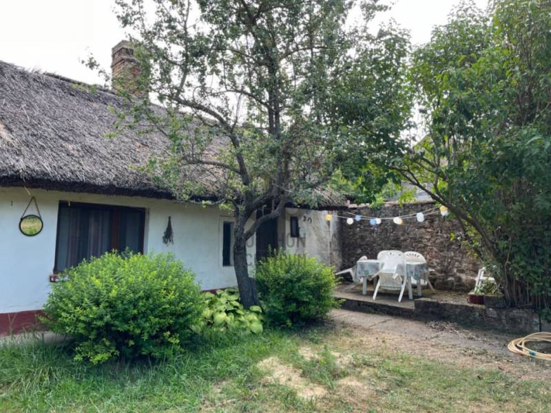 Kővágóörsön, belterületi, központi elhelyezkedéssel találunk rá erre a több, mint százéves kis parasztházra.Udvara kőfallal szeparált kis birodalom, egy olyan utcácskában, ahol nincsen átmenő forgalom! Aszfaltos útról lekanyarodva 20 métert kell murvás úton megtenni.A ház, korából adódóan felújítandó, de jelen pillanatban is a legszebb nyaralások helyszíne egy családnak és barátaiknak.A házhoz tartozó telek 427 nm, a lakóház pedig a tároló melléképületekkel együtt nettó 75 nm. Ez nem változik, ennél nagyobb nem lesz és nem lehet, bár ha kreatívan állunk hozzá, a mostani melléképületekkel könnyedén bővíthetjük ez életteret, hiszen szervesen kapcsolódnak a főépülethez. A telken egy korábban jelen lévő gazdasági épület is jelezve van, amely visszaépíthető.Kő falazatú, nádtetős épület, amely nem védett, így sokminden alakítható rajta a saját igényekhez mérten.Padlója jelenleg beton, amely linóleummal fedett, a melegvizet bojler szolgáltatja, fűtéséről régebben a nagyapa által rakott búbos kemence gondoskodott.Egy nagy lakószoba és egy kisebb hálószoba mellett konyhát, fürdőszobát és 3 tároló helyiséget találunk benne. Kibővített áram (32 A), vezetékes víz és a telken belül csatorna van. Ami fontos: \"Van vele munka\", \"Kell rá költeni\" ... de ugyanakkor: Autentikus, lelke van, tökéletesen elég egy családnak, a Balaton-felvidék szívében van!