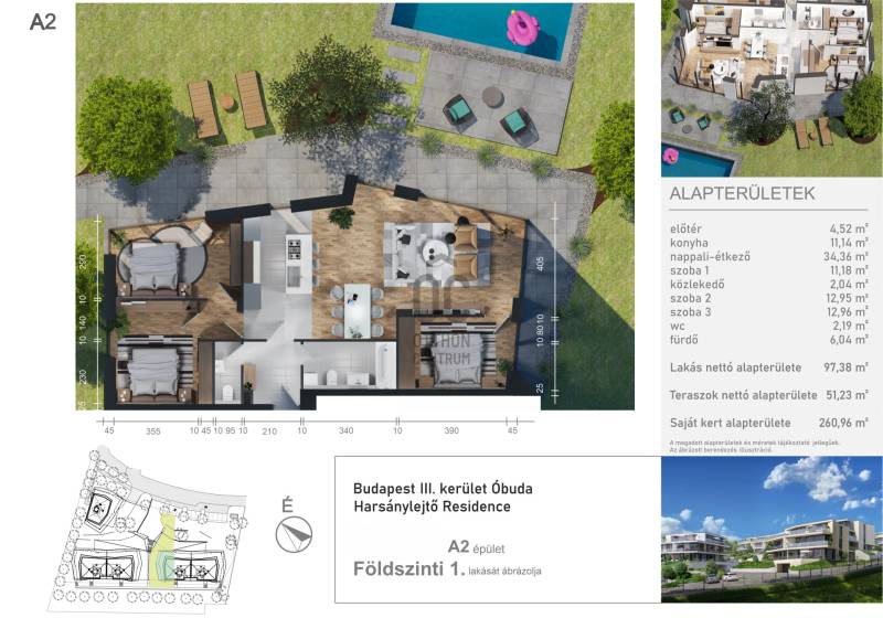 Az ingatlan nettó alapterülete 97,38 m² + 51,23 m² terasz, melyhez saját kertrész is tartozik.Projekt bemutatásaBUDA LEGEXKLUZÍVABB 5 CSILLAGOS LAKÓPARKJA ÉPÜL!A luxus valódi értéke a ritkaságban rejlik. Ahogyan a világ legnagyobb márkái is csak limitált darabszámban kínálják alkotásaikat, úgy a Prestige liget lakásai is kizárólag szűk kör számára elérhető. Itt nem tömegterméket értékesítünk, hanem egy életérzést adunk át!A Hármashatár-hegy lábánál, a Natura 2000 természetvédelmi terület peremén, a fák ölelésében bontakozik ki a modern magyar építészet utópisztikus alkotása!És mégis miért olyan különleges?- A LOKÁCIÓ MIATT! Buda elit villanegyedében járunk, itt nincsenek omladozó tűzfalak, kizárólag modern zöldövezeti villák sora tárul elénk!Néhány perc autóútra található az Árpád híd, a GoBuda bevásárlóközpont, a Kolosy tér az AKG iskola és a British International School. - az erdő szomszédságában található - az erdő melletti legfelső telkeken indul a fejlesztés, a teraszról szinte megérinthetjük a fák lombjait! - budai hegyekre és zöldre néző kilátás, a privát teraszokról, a természetközeliség mellé a szemet nyugtató zöld látvány elképesztően feltöltő hatású...-ultramodern homlokzat, hatalmas üvegfelületekkel! - elképesztő csend és nyugalom -ezzel számolhat, aki itt vásárol - az utolsó építkezés a környéken az utolsó telkeken, így a nyugalom garantált! - PÁRATLAN MŰSZAKI FELSZERELTSÉG - egy lakópark sem versenyezhet minőségben és felszereltségben ebben az árkategóriában!A lokációról bővebben:Harsánylejtő Buda legkedveltebb villaparkos területe, széles utcák, újépítésű villák és modern épületek, illetve szemet gyönyörködtető zöld terület jellemzi. Itt még a fű is olyan zöld, mint Új-Zélandon!A zöldövezeti, kertvárosi milliő verhetetlen lokációval párosul, csendes, zöld környezet, egy ugrásra minden zolgáltatástól!Gépjárművel:Árpád-híd 10 percreBritsih School 8 percreA 2. kerület szintén 10 percreÉs néhány perc alatt elérhető a Gobuda Bevásárló Központ(mozi, Libri, cukrászdák, fodrászat, posta, bankfiók stb..), Lidl, Tesco, a Kolosy tér és minden szolgáltatás amit csak kívánni lehet!A környéket több buszjárat is kiszolgálja, így a város minden pontja könnyedén elérhető!MŰSZAKI TARTALOM:Itt nem a profit, hanem a minőség dominál!Bármely projekttel összehasonlítjuk, nem kérdés merre billen a mérleg! A műszaki tartalomból csak néhány pont:- A budai luxus villák bejárati ajtóinak mintájára extra méretű, több ponton záródó, Mabisz minősítésű HANGSZIGETELT okos bejárati ajtó minden lakáshoz több, mint 2.000.000 Ft-os értékben! - A homlokzatra felhelyezett átszellőtetett homlokzati rendszert borító Prefabond lemezek értéke meghaladja a 200.000.000 Ft-ot!!!!- Extra hanggátlás!!! A hangátló falak hanggátlását tovább fokozzuk épített gipszkarton előtétfallal és 5-5 cm airrock Rockwool kőzetgyapot hangszigeteléssel!- friss levegő egyenesen az erdőből! A hővisszanyerős szellőztetőrendszer egyenesen az erdőből szívja be a friss levegőt, a lakások az ablak nyitása nélkül szellőznek!- Európa vezető alumínium nyílászáró gyártójának piacvezető terméke RC2 - RC3 - PAS 24 betörésvédelemmel, extrém víz és szél ellenállással és extrém akusztikával! Nem csak ultramodern és gyakorlatilag keret nélküli EI30 tűzállóságú, ütésálló ablakok kerülnek beépítésre, de a hanggátlás a bejárati ajtókkal és a falazatokkal együtt utánozhatatlan!5 csillagos minden felhasznált építési termék amelyek I. osztályú munkával párosulnak!A szakemberek a saját területük kiválóságai, mesterségük igazi virtuózai. A felhasznált építési termékek és az elvégzett munka minősége itt nem az ésszerű piaci döntésekről szól, a cél a legek, legje!!!Bár az értéknövekedés elkerülhetetlen, de a projekt lakásait végfelhasználóknak terveztük! Ahogyan minden presztízsprojekt esetében, úgy itt is az előrelátó első vásárlók élvezhetik a legnagyobb előnyöket.Várható átadás: 2027 Q4Nálunk nem lakást vásárol, hanem életstílust, amelyet máshol nem kaphat meg!Várom megtisztelő hívását!