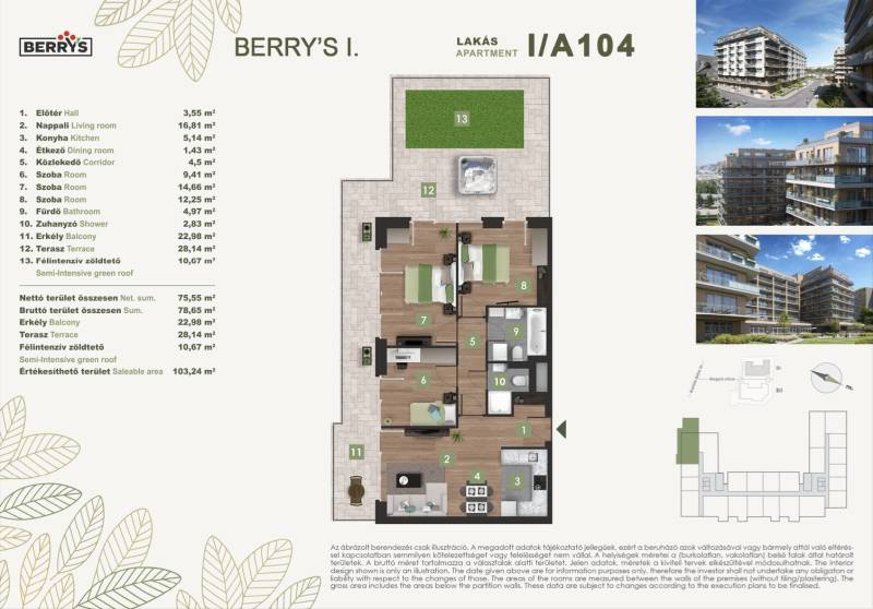 Projekt bemutatásaA XI. kerületi Bartók Béla úthoz közel épülő lakópark egy csendes, nyugodt környezetet kínál a város forgatagához közel. Az újbudai városrészben kialakított új lakónegyed kiváló közlekedési kapcsolatokkal rendelkezik. A zsákutcából nyíló elhelyezkedés biztosítja a forgalommentes, zavartalan lakókörnyezeti életet.A lakópark elhelyezkedése ideális azok számára, akik gyorsan és kényelmesen szeretnék elérni a város bármely pontját. A 4-es metró közelsége, az 1-2 perc sétatávolságra elérhető villamosok és a környéken közlekedő nappali és éjszakai autóbuszjáratok kiváló közlekedési lehetőséget biztosítanak. Az M1-es és M7-es autópályák közelsége, vagy a Kelenföld vasútállomás megkönnyíti az ország minden részébe, kiemelten a Balatonhoz és a Velencei tóhoz tervezett utazásokat.A legmodernebb mennyezeti hűtő- fűtő rendszernek köszönhetően alacsony fenntartási költségek várnak. A zöldtetők és az épület körüli zöldterületek nemcsak természetes hőszigetelést adnak, de a közösségi életet is támogatják.A gyönyörű kilátás nyugalma a városi nyüzsgés harmóniájával. A Berry’s minden lakásához tartozik loggia, erkély, vagy terasz!Várható műszaki átadás: 2027 vége