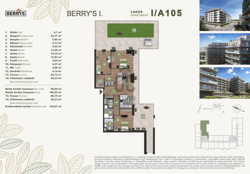 Projekt bemutatásaA XI. kerületi Bartók Béla úthoz közel épülő lakópark egy csendes, nyugodt környezetet kínál a város forgatagához közel. Az újbudai városrészben kialakított új lakónegyed kiváló közlekedési kapcsolatokkal rendelkezik. A zsákutcából nyíló elhelyezkedés biztosítja a forgalommentes, zavartalan lakókörnyezeti életet.A lakópark elhelyezkedése ideális azok számára, akik gyorsan és kényelmesen szeretnék elérni a város bármely pontját. A 4-es metró közelsége, az 1-2 perc sétatávolságra elérhető villamosok és a környéken közlekedő nappali és éjszakai autóbuszjáratok kiváló közlekedési lehetőséget biztosítanak. Az M1-es és M7-es autópályák közelsége, vagy a Kelenföld vasútállomás megkönnyíti az ország minden részébe, kiemelten a Balatonhoz és a Velencei tóhoz tervezett utazásokat.A legmodernebb mennyezeti hűtő- fűtő rendszernek köszönhetően alacsony fenntartási költségek várnak. A zöldtetők és az épület körüli zöldterületek nemcsak természetes hőszigetelést adnak, de a közösségi életet is támogatják.A gyönyörű kilátás nyugalma a városi nyüzsgés harmóniájával. A Berry’s minden lakásához tartozik loggia, erkély, vagy terasz!Várható műszaki átadás: 2027 vége
