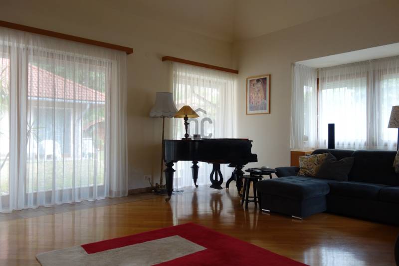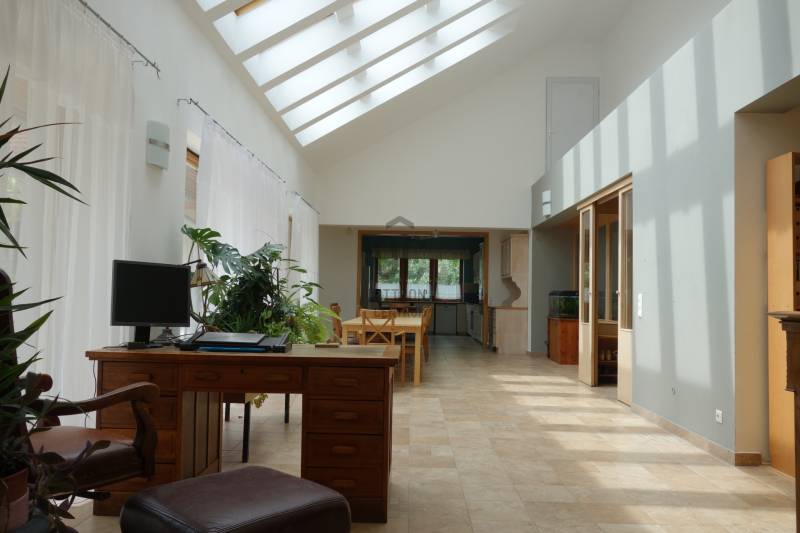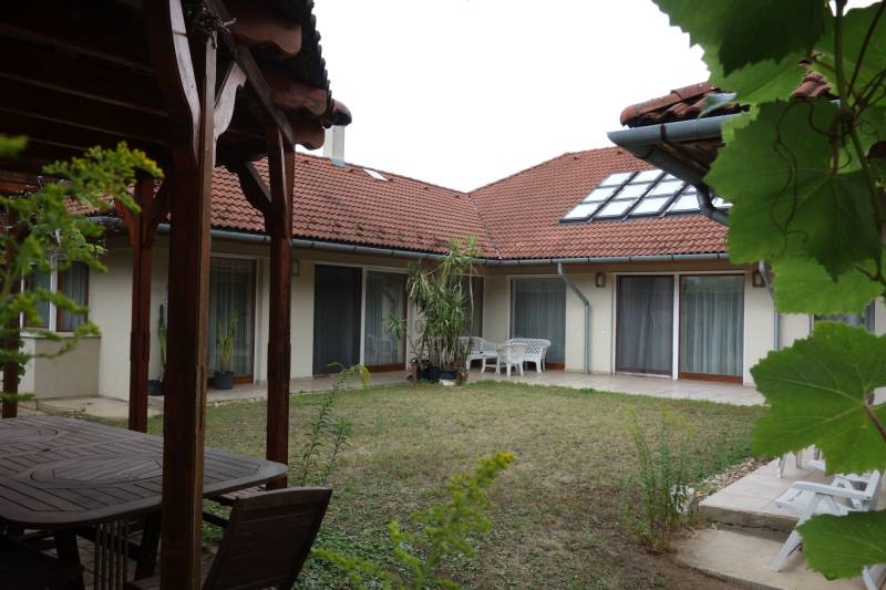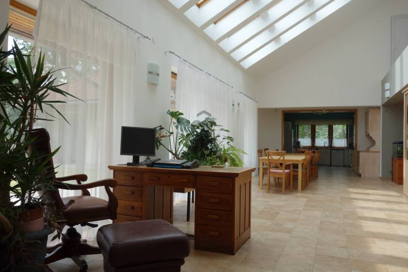 Mogyoródon a méltán kedvelt Szent Jakab lakóparkban eladósorba került egy gyönyörű családi ház. A dupla telken elhelyezkedő ingatlan 2003-ban épült.A körbejárható egy szintes házban nagy terekkel rendelkező otthon kiváló lehet nagyobb családoknak vagy akár több generáció összeköltözésére is. A közel 300nm-s házat 6 szobával, három fürdőszobával tulajdonosai a Feng Shui elvei szerint álmodtak meg. Ennek és az építészeti tervezésnek köszönhetően rendkívül jó energiája vana háznak. Nagy terek, tágas szobák és kényelmes - praktikus kialakítása minden korosztály számára a kényelmet szolgálja. Például mosókonyha, dolgozószoba,gardrobeszoba, fitnesszrészleg és a már beépített tetőteret tárolónak használva. Ez utóbbi tovább fejleszthető, lakótérként használható. Az igen tágas télikertjelenleg étkező-közösségi tér, tetőablakai nyithatóak. A házban akár két különálló lakrész is kialakítható, külön bejárattal. Ennek előkészítése megtörtént, ehhez csupán egy fal megépítése szükséges. Energetikailag kítűnő, besorolása EE, öko jellegű energiafelhasználással. Fűtését a két évvel ezelőtt telepített hőszivattyú, melegvízellátását egy kombi gázkazán biztosítja, mely fűtésre is alkalmas. A házban 4 db klíma található, a hidegburkolatos helyiségekben padlófűtés van. A gyönyörű ősfás nagy telek-kert kiválóan alkalmas családi összejövetelek megrendezésére és kertészkedésre egyaránt. Számos gyümölcsfa, kerti tó és grillező, illetve kemence a szaletli alatt, minden igényt kielégít. A kertben öntözőrendszer és egy kerti tó is kialakításra került. Egy nagyon helyes borospince is helyet kapott a kertben, ahol a család férfitagjai barátokkal elvonulhatnak. Az épület U alakú kialakításával közrefogott terasz és a kert szélvédett, napos. A két állásos garázs tágas, felette tároló kapott helyet. A lakópark nyugalmát őrző-védő szolgálat vigyázza. Nívóját beléptető rendszer és portaszolgálat emeli. A lakópark fenntartása mint közösköltség 25eFt havonta.Aki itt él, csendes, nyugodt zöld környezetben erdő mellett egy másfajta életminőséget tudhat a magáénak. Rendkívül jó a megközelítése, autóval 20-25 perc, hévvel 35perc alatt érhetjük el az Őrs Vezért terét. Tulajdonosai nagyon szeretnek itt élni, gyerekek kirepülése hozatta meg velük az eladás melletti döntést. Várom hívását, egy élmény lesz a bemutató is!