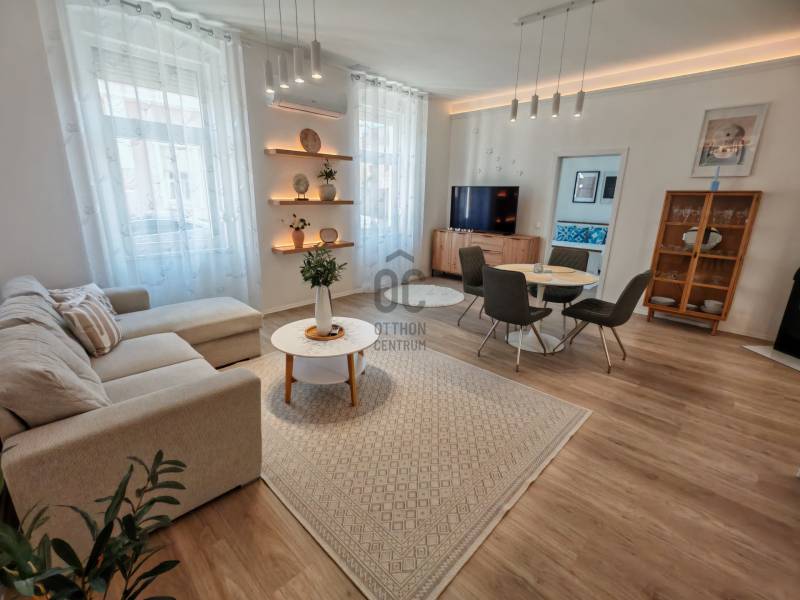 Eladó egy különleges, ízlésesen felújított, bútorozott otthon Keszthely belvárosában!Szívünknek nagyon kedves ez a lakás – magunknak alakítottuk ki, figyelve minden apró részletre. De az élet más irányba vitt minket, így végül nem laktunk benne. Most örömmel adjuk tovább annak, aki elsőként teszi igazán otthonná.Elhelyezkedés:Keszthely belvárosában, 2 perc sétára a főtértől és a sétálóutcától, pár percre a Balatontól. A környék csendes, barátságos, mégis minden karnyújtásnyira van.Főbb jellemzők:• Alapterület: 100 m², hasznos belső tér: 88 m²• Tágas amerikai konyhás nappali étkezővel• 3 hálószoba, 2 fürdőszoba• Bútorozott pergolás terasz – tökéletes reggeli kávéhoz vagy esti borozáshoz• Saját udvarrész, ideális bográcsozáshoz vagy pihenéshez• Pince – tárolásra, kerékpároknak vagy boroknakA lakás egy négyes társasház része, kívül-belül minden részletében megújítva, világos és tiszta. Teljesen bútorozott és gépesített, az összes berendezés vadonatúj és még nem használt (hűtő, sütő, mosogatógép, mosógép, mikró, stb.). Az ár a teljes berendezést is tartalmazza – az új tulajdonosnak már csak be kell költöznie.Az ingatlan vételára 99 millió forint + ingóságok.Így az ingatlanra a kedvezményes, 3%-os hitel felvehető. A teljes vételár: 109 millió forint.