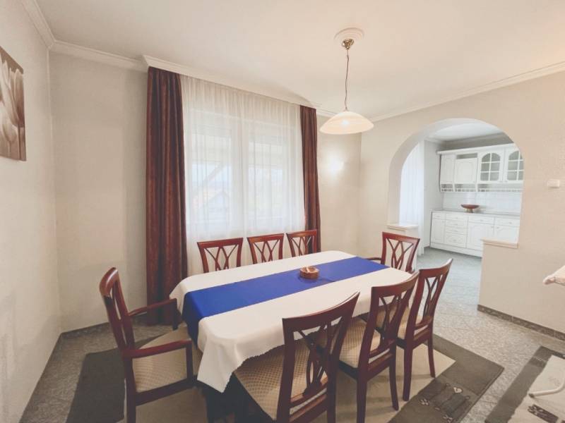 Zala vármegyében 5 SZOBÁS, 2 FÜRDŐSZOBÁS, 2 külön bejárattal, 2 KÜLÖN LAKRÉSSZEL rendelkező, JÓ ÁLLAPOTÚ, TÉGLA családi ház vált eladóvá - Zalaegerszegtől mindössze 20 percnyire!Söjtör központi részén vált eladóvá ez a 200 m2-es hasznos alapterülettel bíró családi ház, bekerített, sík területen nyári konyhával, 2 garázzsal, melléképületekkel!Az ingatlan helyet ad egy tágas étkező-konyhának, egy nappalinak, további 3 szobának, 2 nagyméretű fürdőszobának, külön helyiségben található toalettnek, több tárolónak, egy garázsnak, terasznak (17 m2), s egy erkélynek (6 m2).A fürdőszobák tágasak, mindkét fürdő rendelkezik káddal (az egyikben tetszetős sarokkád került beépítésre) és zuhanyzóval egyaránt.Az ingatlanban a földszinten, udvar felöli megközelítéssel egy önálló lakrész is kialakításra került, ahol egy szoba és egy jól felszerelt konyha található.Szerves részét képezi az ingatlannak több melléképület: még egy különálló garázs az udvarban, fedett pihenősarok, nyári konyha, tároló épületek, állattartásra alkalmas épületrészek, műhely stb.A kimondottan szép állapotnak örvendő családi ház és a melléképületek is téglából épültek, nyílászárói jó állapotú, fa nyílászárók, rolóval, szúnyoghálóval ellátottak, a ház vasbeton födémmel rendelkezik, tetejének fedése cserép.A családi ház melegvíz ellátásáért és fűtéséért egyedi gáz cirkó fűtés felel lapradiátor hőleadókkal.Az ingatlanon három fázis áram van.Az ingatlan helyiségeit, műszaki felszereltségét, külső állapotát tekintve jó állapotú, és igényeknek megfelelően akár AZONNAL KÖLTÖZHETŐ!A tágas otthon egy minimális lejtéssel rendelkező, körbekerített, 2497 m2 - es területen helyezkedik el, mely sok bokornak, gyümölcsfának ad otthont, valamint az állatok számára alkalmas melléképületek megléte lehetővé teszi azok tartását is.A birtokon jelenleg egy nagyobb, első, füvesített udvar van leválasztva a garázzsal, a nyári konyhával, a középső részén találhatóak a melléképületek, majd a gazdálkodásra alkalmas területrész következik. A családi ház lokációját tekintve nagyszerű: csendes, nyugodt, zöld környezetben helyezkedik el Söjtörön, Zalaegerszegtől mindössze 23 km távolságra autóval.A mindenki számára fontos szociális és egészségügyi ellátottság a településen hiánytalanul jelen van (óvoda, iskola, orvosi rendelő, posta, boltok, étterem, templom stb), azonban Zalaegerszeg elérése is 20 perc alatt megoldott.Az ingatlan falusi CSOK-ra IS alkalmas!A megkímélt, újszerű bútorok megállapodás tárgyát képezik.Ajánlom azoknak: - akik előnyben részesítik a csendet és a nyugalmat, egy várossal szemben - akik szeretnék megtermelni a zöldséget és gyümölcsöt családjuk számára - akik megfizethető áron szeretnének hozzájutni egy jó állapotú, azonnal beköltözhető, tágas családi házhoz, - akik a munka, iskola, óvoda miatt fontosnak tartják a város adta lehetőségeket és Zalaegerszeg gyors elérését!Az ingatlan hétvégén is megtekinthető, további információkért, időpontért keressen bizalommal!