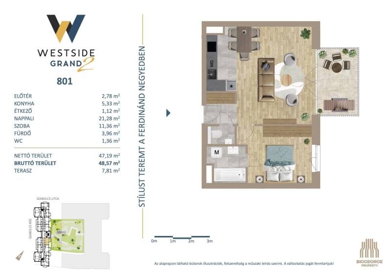 Projekt bemutatásaA projektrőlA Westside Grand I-II. a Biggeorge Property Westside fejlesztés sorozatának - a Westside Residence és a Westside Gardent követően - legújabb tagja.LokációBudapest egyik leggyorsabban fejlődő kerületének központi területén, a XIII. kerületben, a Városligettől és a megújuló Nyugati pályaudvartól sétatávolságra épül. A Nyugati pályaudvar környéke az elkövetkezendő években szinte teljesen megújul, a XIII. kerületben elhelyezkedő Szabolcs utcában, illetve közvetlen környezetében számos új építésű ingatlan épült, melyek jelentős értéknövekedést kínálnak a környéken ingatlant vásárlóknak. A több ütemben megvalósuló lakóingatlanfejlesztések hatalmas zöld parkot ölelnek körül, így a lakók akár az erkélyen ülve is élvezhetik a csendet, nyugalmat és zöld környezetet egy központi, belvárosi környezetben is.