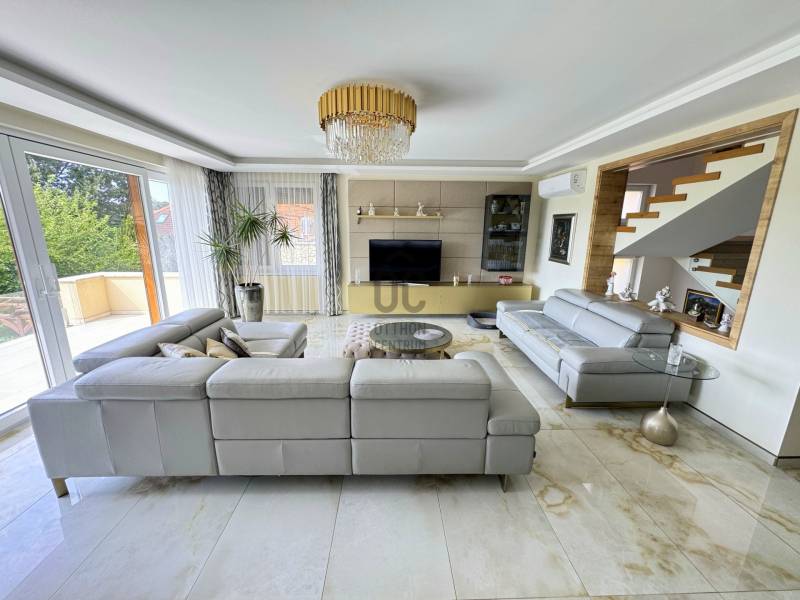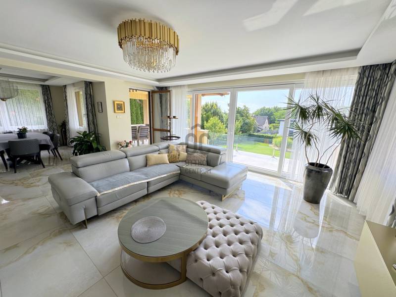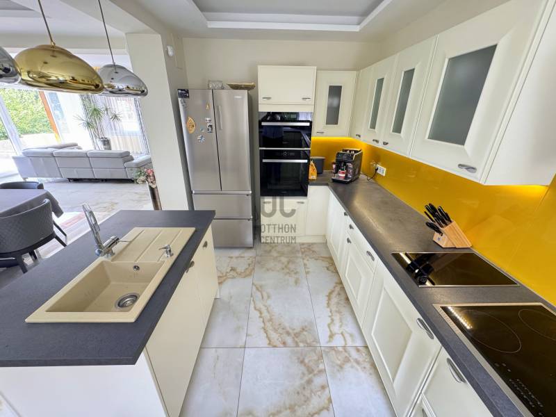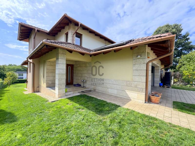 Gödöllőn eladóvá vált egy rendkívüli minőségben megépített 328nm-es, 7 szobás önálló családi ház 1200nm telekkel!A város központjához közeli Fenyves körzetben találod, impozáns környéken, ahol csak újszerű és űj építésű házakat találsz.Ez a prémium minőségű egyedi Otthon igazi ritkaság és csak olyanoknak ajánlom, akik a mediterrán stílusú meleg szineket kedvelik és a luxust.A három szinten mindent megtalálsz ami ahhoz kell, hogy kényelmesen, békében és biztonságban élhess családoddal.Akár az 5 hálószobáról, 4 fürdőszobáról vagy többi kiegészítő helyiségről legyen szó, itt mindenki megtalálja a számítását!+ A ház 2019-ben épült, 30-as Porotherm téglából, melyre 15cm szigetelés került. A födém teljes értékű, nagy teherbírású szigetelt beton födém, a padlástér tárolásra alkalmas és a tetősík is szigetelt.+ 10 kw-os napelem látja el a ház elektromos áram igényét, ez elegendő a teljes háztartás áramellátására, beleértve az elektromos autók töltését.+ A ház fűtését jelenleg gázkazán biztosítja, ám már megvásárlásra került egy új hőszivattyú, ami beszerelésre kész és a vételár részét képezi.+ A középső szinten padlófűtés van, a többi szinten radiátorok. Ezeket egészíti ki a fan-coil rendszerű hűtő-fűtő klíma minden helységben.+ Az alsó szinten kapott helyet egy nagy méretű háztartási helyiség és mosókonyha, egy kisebb, lépcső alatti tároló, egy közösségi tér, valamint egy további szoba saját fürdőszobával. Ezen túl még egy szauna és egy újabb fürdőszoba.+ A bejárati szinten lévő a két autó számára kényelmes, tágas garázsból az előszobába érkezünk, ahonnan egy vendégmosdó nyílik. Tovább haladva a ház többi részétől szeparált szoba található, mely remekül használható akár vendégszobaként vagy dolgozóként.+ Innen a tágas nappaliba juthatsz, ami mellett helyett kapott egy teljesen felszerelt szigettel is ellátott konyha-étkező. Ezen túl egy lenyűgöző kilátással ellátott erkély is növeli a komfort érzetet.+ A felső szinten három külön nyíló szoba erkély kapcsolattal, valamint két fürdőszoba található, egyikük közvetlenül az egyik hálószobából nyílik, így teljesen privát.További extrák: fürdésre alkalmas kerti tó, élménymedence, minden ablak szúnyoghálóval és redőnnyel felszerelt, riasztó rendszer, kapucsengő, központi porszívó, rengeteg beépített gardrób szekrény, autómata öntöző rendszer stb.Az ingatlan jogilag rendezett, akár hitelre is megvehető és akár 2-3 hónap alatt is költözhető. Bár az otthon start hitelre nem jogosult, hidd el sok extrái miatt megéri a piaci hitelt felvenni rá.Rengeteg érv szól e mellett a remek Otthon mellett, de inkább gyere el, nézd meg és szeress bele te is!