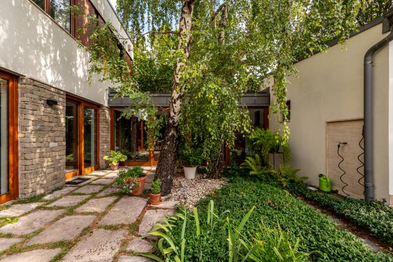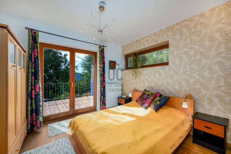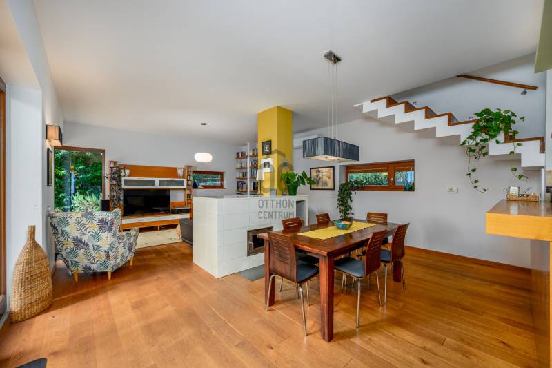 Lenyűgöző természetközeli luxus, ahol a design és a környezet tökéletes összhangot alkot!Nagykovácsi Cseresznyés részén áll ez a ház, melynek tervezésekor az volt a fő szempont, hogy a meglévő fák megmaradjanak – a végeredmény egy építészeti remekmű, ami körbeöleli az élő természetet. A fák árnyéka természetes hűtést és páratlan atmoszférát biztosít. A lehető legtöbb helyen hatalmas üvegfelületek engedik be a fényt és szinte elmossák a bel- és kültér közötti határokat. A ház egyik különleges építészeti megoldása a télikert, amely olyan érzetet nyújt, mintha közvetlenül a kertben sétálnánk.Mindezt a hatást fokozza a ház teraszairól elénk táruló csodás panoráma.Főbb paraméterek:- 237 m2 nettó alapterület- 2 lakószint + szuterénszinten a garázs- nappali + 4 szobaA szobák elosztása lehetővé teszi különböző generációk elkülönülését- 3 fürdőszoba + 2 kézmosós wc- fűtés: kondenzációs kazán, (szobákban radiátor, nappali-étkezőben padlófűtés), 3 db hűtő-fűtő split klíma, nappaliban cserépkályha- parkolás: 2 állásos garázs + nyitott beálló- 24 m2 fedett terasz- 11 m2 nyitott terasz- 17,8 m2 erkélyMűszaki paraméterek:- Porotherm 30 külső falazat+ 15 cm hőszigetelés- tető: VM-Zinc horganylemez- 3 rétegű fa nyílászárók - tölgy svédpadló padló- és lépcsőburkolatok- furnérozott tölgy belső ajtók- teraszok burkolata: kerámia, vörösfenyő, travertin mészkő- tetőn 5,3 kW-os napelemrendszer- automata öntözőrendszer- kerti csobogó- kerti tárolóAjánljuk 4-5 fős családoknak vagy nagyszülőkkel összeköltözőknek.Ha szeretné megtekinteni, várom hívását!