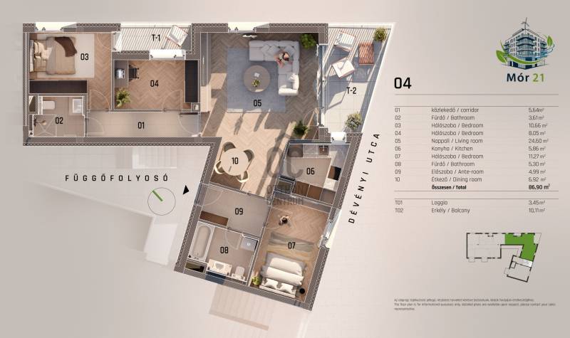 Fedezze fel ezt a lenyűgöző, új lakást, amely tökéletes választás lehet mind magánéleti, mind befektetési célokra. Az ingatlan alapterülete 86,9 négyzetméter, amely négy tágas szobát foglal magában, így ideális otthont biztosít családok számára, vagy akár több generáció együttélésére is.A lakásban két modern fürdőszoba található, amelyek kényelmet és praktikus megoldásokat kínálnak a mindennapok során. Az ingatlan állapota kiváló, a hőszivattyús fűtés és hűtés pedig biztosítja az optimális klímát az év bármely szakában. A 10,11 négyzetméteres erkélyről gyönyörű panorámás kilátás nyílik, amely lehetőséget ad a pihenésre és a szabadban való időtöltésre, emelettett egy Loggia is kialakításra kerül. Képzelje el, ahogy egy fárasztó nap után a teraszon ülve élvezi a naplementét, miközben a város zaja távol marad. A lakás biztonságos környéken található, ahol garantált a nyugodt életvitelt. A közlekedési lehetőségek kiválóak, hiszen a közeli busz- és villamosmegállók gyors és kényelmes eljutást biztosítanak a város többi pontjára. Az autós közlekedés is egyszerű, a közeli főutak gyors hozzáférést biztosítanak a városközponthoz és a környező településekhez. A környéken számos üzlet, iskola és egészségügyi intézmény található, így minden szükséges szolgáltatás könnyen elérhető. Ez az ingatlan nemcsak egy lakás, hanem egy lehetőség arra, hogy egy olyan környezetben éljen, ahol a mindennapok kényelmesen és biztonságosan telnek. Az ingatlan funkciója sokféle lehetőséget kínál, legyen szó családi otthonról vagy befektetési céllal történő vásárlásról. A modern építési technológiának köszönhetően a fenntartási költségek alacsonyak, ami hosszú távon is kedvező választássá teszi ezt a lakást. Bármilyen kérdése van az ingatlannal vagy a vásárlási folyamattal kapcsolatban, bátran keressen meg. Bizalommal állok rendelkezésére, hogy segítsek Önnek a legjobb döntés meghozatalában!Projekt bemutatásaA Mór utca és Dévényi utca sarkán, egy hangulatos saroktelken épül fel ez a 23 lakásos, modern megjelenésű, mégis a környezetébe harmonikusan illeszkedő társasház. A kivitelezés során kiemelt figyelmet kapott a benapozás, a jól élhető terek kialakítása, valamint a magas műszaki tartalom.Az épület földszint + 5 emelet kialakítású, pinceszinttel, ahol teremgarázs és tárolók is helyet kaptak. Minden szinten ergonomikusan megtervezett, kiváló elosztású lakások találhatók, jellemzően 42–90 m² közötti alapterülettel. A legtöbb lakáshoz saját loggia, erkély vagy terasz tartozik – a felső szinten exkluzív nagy teraszos lakások kerültek kialakításra.A társasház minden szempontból megfelel a mai kor elvárásainak:– 23 parkolóhely (12 a pinceszinten, 11 a földszinten), Elektromos autó töltési lehetőséggel– 6 tároló,– zöldtető és közösségi tetőkert,– geotermikus hőszivattyús fűtés és hűtés,– padlófűtés, fan-coil hűtés,– háromrétegű nyílászárók, korszerű hő- és hangszigetelés,– liftes megközelítés minden szinten.Az épület anyaghasználata prémium minőségű: terrakotta árnyalatú burkolólapok, világosszürke betonhatású elemek és szignálfehér falfelületek teszik igazán különlegessé a házat.A kiváló infrastruktúrájú környék – Jász utca, Lehel út, Róbert Károly körút, M3-as közelsége – garantálja a gyors közlekedést, míg a környező parkok, új fejlesztések és szolgáltatások emelik a lakók életminőségét.Ez a projekt ideális választás lehet városi otthont keresőknek, tudatos befektetőknek és azoknak, akik értékelik a magas minőséget és az élhető, modern lakókörnyezetet.