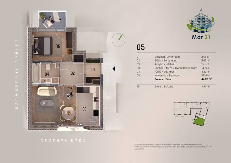 Projekt bemutatásaA Mór utca és Dévényi utca sarkán, egy hangulatos saroktelken épül fel ez a 23 lakásos, modern megjelenésű, mégis a környezetébe harmonikusan illeszkedő társasház. A kivitelezés során kiemelt figyelmet kapott a benapozás, a jól élhető terek kialakítása, valamint a magas műszaki tartalom.Az épület földszint + 5 emelet kialakítású, pinceszinttel, ahol teremgarázs és tárolók is helyet kaptak. Minden szinten ergonomikusan megtervezett, kiváló elosztású lakások találhatók, jellemzően 42–90 m² közötti alapterülettel. A legtöbb lakáshoz saját loggia, erkély vagy terasz tartozik – a felső szinten exkluzív nagy teraszos lakások kerültek kialakításra.A társasház minden szempontból megfelel a mai kor elvárásainak:– 23 parkolóhely (12 a pinceszinten, 11 a földszinten), Elektromos autó töltési lehetőséggel– 6 tároló,– zöldtető és közösségi tetőkert,– geotermikus hőszivattyús fűtés és hűtés,– padlófűtés, fan-coil hűtés,– háromrétegű nyílászárók, korszerű hő- és hangszigetelés,– liftes megközelítés minden szinten.Az épület anyaghasználata prémium minőségű: terrakotta árnyalatú burkolólapok, világosszürke betonhatású elemek és szignálfehér falfelületek teszik igazán különlegessé a házat.A kiváló infrastruktúrájú környék – Jász utca, Lehel út, Róbert Károly körút, M3-as közelsége – garantálja a gyors közlekedést, míg a környező parkok, új fejlesztések és szolgáltatások emelik a lakók életminőségét.Ez a projekt ideális választás lehet városi otthont keresőknek, tudatos befektetőknek és azoknak, akik értékelik a magas minőséget és az élhető, modern lakókörnyezetet.