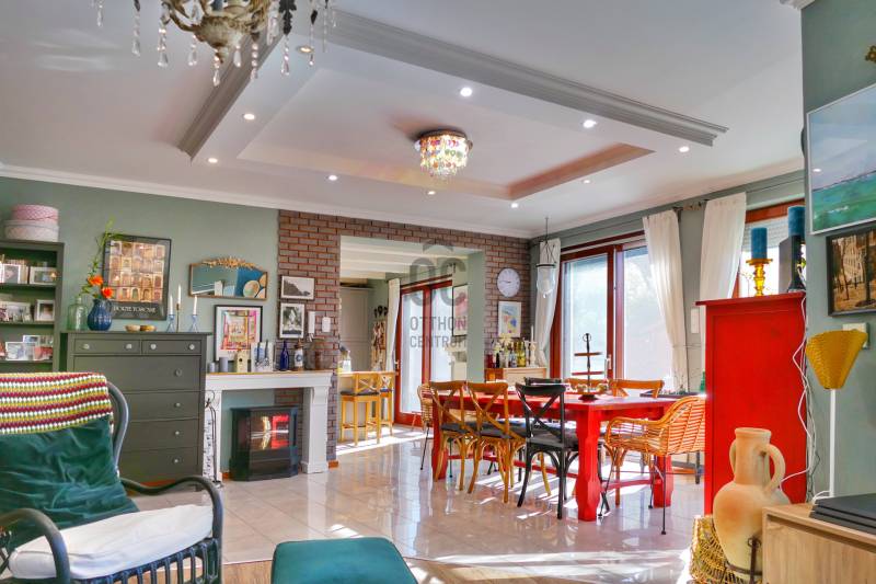 Szentendrén, kiválóan megközelíthető, gondozott, lakóparki környezetben található ez a tágas, világos, meleg, családias hangulatú otthon.Az ingatlan lakóparkon belüli elhelyezkedése is kedvező, mivel szélső ház, viszonylag nagy telek tartozik hozzá, illetve van garázs is.Az emeleti hálószobák mérete megengedné, hogy akár két szobát alakítsanak ki belőlük.Olyan, akár többgyermekes családoknak ajánlanám, akiknek fontos a biztonság, illetve a gyerekek önálló közlekedése az otthonuk és az iskola között.