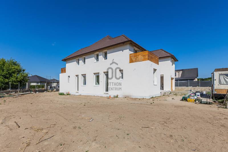 KIEMELT AJÁNLAT!Kiváló referenciákkal!A fényképeken korábban értékesített referenciák láthatók. A látványtervek és a telekről készült képek mutatják a jelenlegi ingatlant.ÚJONNAN ÉPÜLŐ LAKÓPARKBAN, a Waldorf iskolától 2 utcára épül ez az ÚJÉPÍTÉSŰ IKERHÁZ.Egymással mindössze egy tárolónál érintkezve, teljesen SZEPARÁLT KERTRÉSZEKKEL.A helyiek által kedvelt CSENDES, ZÖLD UTCÁBAN, KITŰNŐ MINŐSÉGBEN készül, 460 m2 saját telken.Itt biztosan megtalálja a nyugalmat, aki arra vágyik.Ezen a területen nincsenek és nem is lesznek látható kábelek, ez egy rendezett, újonnan épülő lakópark.Az épület 40cm vastag fallal épül, műanyag nyílászárókkal 3 rétegű hőszigetelt üvegezéssel, Terrán Zenit Resistor Onix tetőcserép fedéssel, hőszivattyú kiállással, padlófűtéssel, napelem-, riasztó-, és klímaelőkészítéssel, illetve egy klíma egységgel a nappaliban.A hálószobákba laminált padló, a többi helyiségbe járólap kerül, de ez most még igény szerint módosítható.A FŰTÉSE és a FENNTARTÁSA KEDVEZŐ, a korábbi referenciákkal kapcsolatos tapasztalatok alapján a TELJES HAVI REZSI legfeljebb 40-45 ezer forint, és napelemmel REZSIMENTES tud lenni az ingatlan.Napelem beszerzését és kedvezményes beszerelését az ár megbeszélés alapján tartalmazhatja.Fúrt kút is található a telken, bemért, iható vízzel.Csatorna kiépítése után az utca és a környék is aszfaltozva lesz.Az építés jelenleg is zajlik, ezért a BURKOLATOKAT Ön még KIVÁLASZTHATJA, igényeit megadhatja, így a lehető legjobb időben van.Az egyik fél már elkelt, a másik még elérhető.Nettó 99 m2 lakótér, nappali+2 szoba, 2 fürdőszoba és garázs.Igény szerint a garázs még kérhető szobaként, akkor nappali+3 hálószobás lesz az ingatlan, ebben az esetben egy fedett, viacolorozott autóbeállót is tartalmaz az ár.10 percen belül szinte minden elérhető: busz, ovi, suli, boltok posta, cukrászda, virágos, gyógyszertár, benzinkút, stb.ÁTADÁS 2026. május 31-ig, igény szerint hamarabb.Minimum 10 % foglalóval és 20% önerővel LEKÖTHETŐ.CSOK, Hitel, Babaváró és illeték visszatérítés igényelhető rá.Nagyon jó választás mind az ingatlan, mind a lokáció.Hívjon bizalommal a hét bármely napján!Amennyiben saját ingatlanja eladásához a mi irodánkat választja, ezt minőségi szolgáltatások és kedvező feltételek mellett vállaljuk.Az ingatlan CSOK igénybevétele esetén illetékmentes!CSOK, Babaváró, Lakásfelújtás, Támogatott hitelek? Irodánk minden állami támogatás és lakáshitel igény kapcsán DÍJMENTES és SZAKÉRTŐ segítséget nyújt!Igény szerint profi ügyvédi hátteret is biztosítunk.