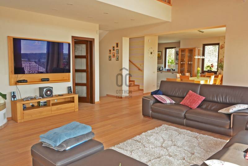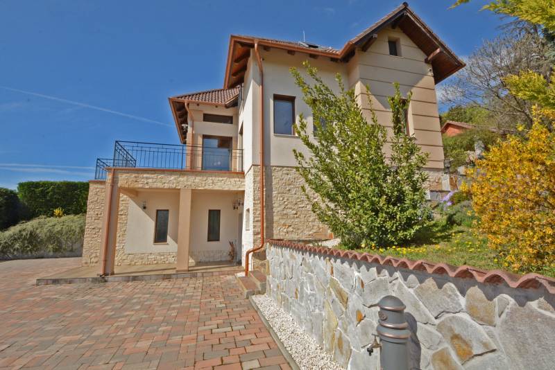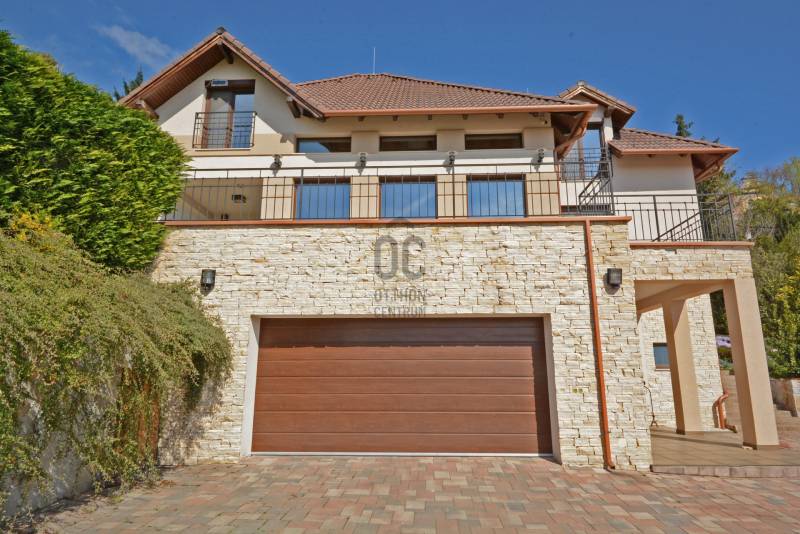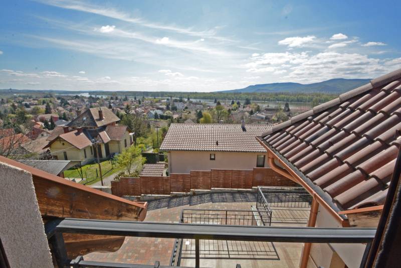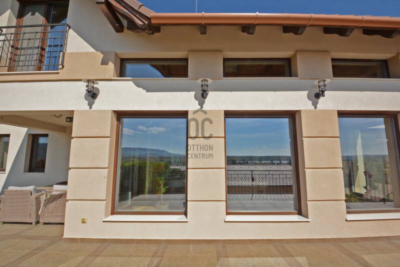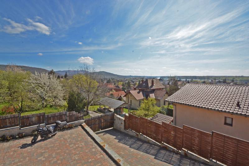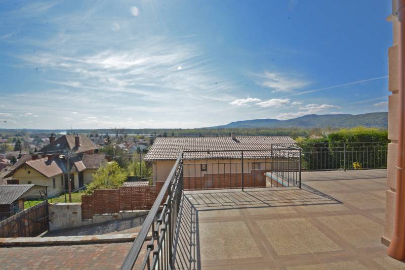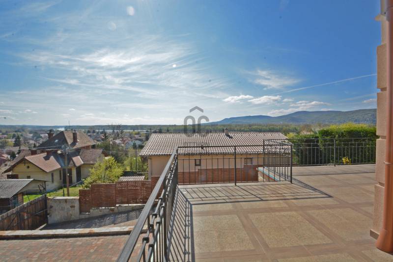 Alap adatok:- 1743 nm telekterület.- Két helyrajzi szám. ( 892+851 nm)- 2016-ban épült 3 szintes panorámás luxus családi ház, 4 lakószobával, panorámás nappalival,342 nm hasznos alapterülettel.- 60 nm-es panorámás terasz.- 4 autó részére garázs elektromos töltőfejekkel.- 6 autó részére gépkocsi beálló.- Fedett úszómedence, - 6 Kw szaldós napelem rendszer.- Hőszivattyús, elektromos, gáz és vegyes tüzelésű fűtés ki van alakítva és igény szerint kombinálható.- A világ legbarátságosabb full panorámás nyári konyhája tetővel, pultokkal raktárhelyiségekkel.- Elvehetetlen panoráma a Dunakanyarra- Egy 28 nm-es két szobás vendégház a másik helyrajzi számú telken.Verőce kis település a Duna bal partján 4160 lakossal. Budapest belvárosától a távolság 36 km légvonalban. 52 km közúton, mely gépkocsival kb. 1 óra. Vonattal Budapest Nyugati Pályaudvarról Verőce vasútállomásig Z70-es zónázó vonattal 31 perc.A telkek a település központjától 50 méterre, a vasútállomástól 200 méterre, a Duna partján lévő sétánytól 250 méterre, a kezdődő domboldalon helyezkednek el. Teraszos kialakítással különülnek el egymástól. Az alsó telek talajfeltöltésének köszönhetően mindkét ingatlan kertjéből örök panoráma nyílik a Dunakanyarra és a szemközti Pilis hegyvonulatára. Két telek, két helyrajzi szám, két utcai kapu, két külön közmű bekötés. Dologösszességben akarjuk értékesíteni a két telket.Az alsó telek 892 nm-es, a feltöltésnek köszönhető nagyrészt sík területekkel rendelkezik, rajta 3 szintes, szintenként 100 nm alapterületű családi házzal, melynek építését 2015 ben kezdték, a használatba vételi engedélyét 2019-ben adták ki. A földszinten a fűtött garázsfeljárón keresztül egy sík gépkocsibeálló mögött közel 60 nm -es, négy gépkocsi tárolására alkalmas garázs helyezkedik el, benne elektromos autók gyorstöltésére alkalmas fejegységgel. Mögötte 15 nm-es bortároló található. A földszinti folyosóról nyílik egy 10 nm-es helyiség, ahol a szauna előkészítés és egy zuhanyzó kap helyet. A szauna ezidáig nem került beépítésre, jelenleg raktárként funkcionál. A földszinten még egy különálló wc is ki lett a alakítva, ami az előszobából nyílik.Az első emeletre lépcsősor vezet, ahol egy 5.5 méteres belmagassággal rendelkező, hatalmas üvegablakokkal a Dunakanyarra panorámás nappali szoba található, ahonnan a szintén Dunai panorámás, közel 60 nm alapterületű teraszra juthatunk ki. A terasszal egy szintben van a gondozott pázsitos kert, ami egy támfallal különül el az alatta lévő telektől, a rajta lévő ház fölé emelve azt. A kertből szintén korlátlan a panoráma.A nappali szobából nyíló konyha és kamra a földszint és az első emeleti előkert közti rézsűs virágoskertre néző ablakokkal rendelkezik. Az első emeleti nappaliból nyílik az a háztartási helység, ahol a mosógépek és az épület gázcirkóval valamint hőszivattyúval kombinált fűtés és meleg víz rendszerének gépészete található.A nappaliból nyílik a szülői háló, melynek saját fürdőszobájában pezsgőfürdős kád, dupla mosdókagyló és wc kap helyet.Az első emeleti terasz és kert szintjén található az épület mellett jobb oldalt elterülő telekrész, ahol egy fedett kültéri konyha, és a hozzá tartozó 15 nm-es külső tároló kap helyet. Az oldalfalak nélküli konyhából elvehetetlen panoráma nyílik a Dunára és a környező hegyekre. A külső konyha hátsó oldalfalát a mellette lévő telek szinteltolását tartó támfal adja. A külső konyha tetőszerkezetén találhatóak az a napelem rendszer, mely a szaldós áram visszatáplálási rendszer gerincét alkotja. Az épület első emeletének szintjén a ház mögötti kertrészen van kialakítva az a csúsztatható boltíves polikarbonát tetővel ellátott kültéri medence, mely ellenáramoltatóval, fűtő berendezéssel és nagy teljesítményű vízforgató és homok alapú szűrőberendezéssel van ellátva. A medence melletti kültéri zuhanyzó alatt található a medence gépészeti egysége, míg a belépő vízrendszer központja a medence melletti tároló épületben helyezkedik el. A medence mellől indul az a széles lépcsősor, mely a fölötte lévő telekre vezet, mely ettől a szinttől egy támfallal különül el.A ház harmadik szintjén a nappalival egy légtérben, onnan a nappali ablakain keresztül a Dunakanyarra panorámás felső galéria kap helyet, ahonnan a harmadik szint három lakószobája érhető el. A ház jobb felében lévő két különálló szobához egy zuhanyzós fürdőszoba tartozik, míg a ház bal oldali részén lévő nagyobb hálószoba önálló zuhanyzós fürdőszobával rendelkezik.Az épület elektromos redőnyökkel szerelt. A fűtést és a meleg víz ellátást gáz cirkó és hőcserélős fűtőberendezés kombinált használatával lehet megoldani, mely lehetőséget biztosít arra, hogy az éves gázhasználatot a támogatott lakossági mennyiség alatt lehessen tartani. A szaldós napelem rendszernek köszönhetően elektromos gépjárművek töltése és a hőcserélős fűtési rendszer üzemeltetése mellett is a lakossági támogatott szint határértéke alatt tudják tartani a fogyasztást a jelenlegi tulajdonosok.A felső 851 nm-es, enyhén emelkedő telek. Rajta 28 nm alapterületű két hálószobás, zuhanyzós fürdőszobával, wc-vel és külső tárolóval ellátott vendégház áll, mely jelenleg irodaként funkcionál. Fűtése gáz konvektor és elektromos padlófűtés, de újonnan épült vegyes tüzelésű kémény már rendelkezésre áll, akár kályhának akár kandallónak. A telek ősfás, egyik részén gondozott, futtatott szőlőtőkékkel. Az alatta lévő telektől egy támfal választja el, melyben beép