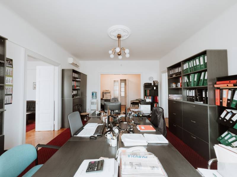 Exkluzív megvételre kínálunk Budapest V. kerületének Honvéd utcájában, az Alkotmány utca és a Parlament közvetlen közelében, egy 111 m²-es, 4. emeleti lakást egy impozáns, műemlék társasházban.Az ingatlan jelenleg iroda, de adottságai révén könnyen átalakítható rendelővé vagy egy tágas, elegáns otthonná. A lakás világos, délelőtti órákban napfényes, tágas szobákkal rendelkezik, a tárgyaló jelenleg az egykori konyha helyén található, így különleges elrendezést biztosít.Főbb jellemzők:- 4. emelet, liftes, műemlék társasház.- Alapterület: 101 m², jelenlegi elosztás: 4 szoba + konyha + előszoba.- Fürdőszoba jelenleg nincs kialakítva, két illemhely áll rendelkezésre.- Gáz ki van kötve, visszakötés könnyen megoldható.- Házközponti fűtés, lakásonként egyedileg szabályozható.Társasház:- Rendezett, impozáns műemléképület.- Homlokzat felújítva 5 éve.- Jelentős megtakarítás a ház kasszájában- Közös költség: 56.000 Ft/hó, víz- és fűtéssel együtt.Elhelyezkedés:A Belváros szívében, kiváló közlekedéssel, a Duna-part, a Parlament, kávézók, éttermek és üzletek közvetlen közelében. A környék kulturális és gazdasági szempontból is kiemelkedő, ideális helyszín irodának, rendelőnek vagy otthonnak.Megtekintés:Heti két alkalommal, munkaidő után, előre egyeztetett időpontban.