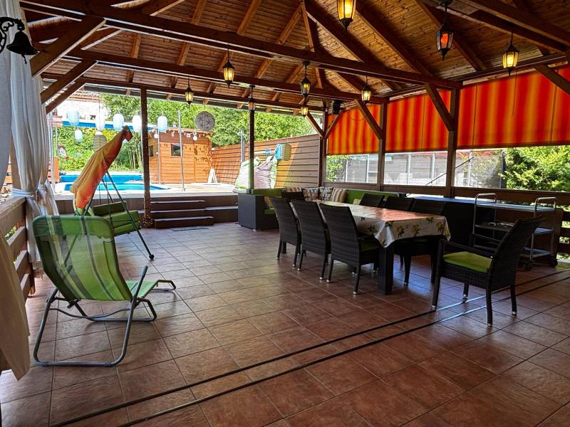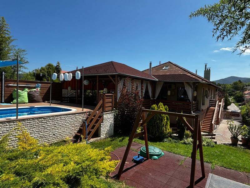 Luxus családi ház a dunakanyarban, akár 2 generációnak is, rövidtávú bérbeadás esetén 7 éves megtérüléssel, hatósági engedéllyekkel, (KTSZ, NTAK, ÁNTSZ, NÉBIH) további fejlesztési lehetőségekkel komoly vállalkozással, pályázatra alkalmas 16 éves céggel, akár 3% 100 milliós hitelfelvételi lehetőséggel, magas foglaltsággal eladó!Itt található a régió legmagasabb felszereltségű wellness terasza és egyediként kínál, nagyméretű engedélyezett gépészettel rendelkező fűthető, nyitott úszómedencét.Pilismaróton minden kényelemmel felszerelt, minőségi anyagokból 2015-ben épült, két szintes, nettó lhasznos 420 m² összbeépített ház, medencével, jakuzzival, szaunával. A két vendég lakás egy szinten található, mely külön bejárattal rendelkezik, de egybe is nyitható.Az alsó szint 200 m², több helyiséggel (volt sütődei tevékenységgel) jelenleg üres állapotban, 2 fürdő, 2 wc, 2 konyha felszereltséggel.A több célú hasznosíthatóságra minden lehetőség adott!Kiválóan alkalmas a vállalkozás továbbfejlesztésére, turisztikai céllal a vendégház bővítésére, szabadidős tevékenység, wellness, vagy újabb lakóegység kialakítására! Teljesen külön bekötött ipari közművekkel műhely és/vagy ipari tevékenység folytatására.Műszaki tartalom:-Teljesen külön bekötött ipari közművekkel műhely és/vagy ipari tevékenység folytatására.-Víz, csatorna, villany: 3x35 A, gáz: ipari 26 m³ és háztartási 6 m³ órával.- 18,5 kW teljesítményű napelem került felszerelésre, mely a teljes villanyfogyasztást fedezi, a szaunával, jakuzzival, medencével együtt is!-A helyiségek klimatizáltak, radiátoros-, és padlófűtéssel (gáz cirkó), szunyoghálóval, riasztóval ellátottak. Az egyik nappaliban hangulatos téglahályha is melegít. Az egész ház kívülről szigetelve, a padlástér szintén szigetelt, hasznos 80 m² beépíthetőséggel.-Távirányítós tolókapu.-Zárt, fedett villany-, gázfogadó és kukatároló.-Az egész ház rögzítős kamera rendszerrel ellátott. Riasztó rendszere őrző-védő céghez bekötve.-Internet ( wifi az egész házban), műholdas televízió.-Térburkolat: 52,5 m² 5-6 gépkocsi részére beálló kialakítva-A házból nyílik a 70 m²-es, fedett terasz, gyönyörű fagerendás tetővel és a 60 m²-es wellness terasz: 18 m³-es fűthető medencével, 6 személyes jakuzzival és a szauna csobbanó medencével.-A terasz alatt 2 helyiséges, polcrendszerrel beépített, klímával felszerelt, vizes blokkal is rendelkező pince-tároló.-A nagyméretű, karbantartott mediterrán kertben kiépített locsolórendszer, gyerekjátszó, valamint 2 helyiségből álló műhely és tároló épült. Ennek füvesített tetején egy tűzrakó hely, a pilisi hegyek látványával.-A telek legmagasabb pontján dunakanyari panorámával 4 m-es épített kilátó áll.