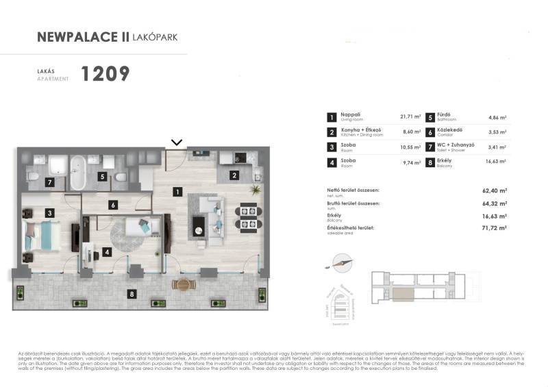 Projekt bemutatásaNew Palace II. ütemA New Palace a XIII. kerület csendes részén épül. A megújult kertvárosias környezet a pesti oldal egyik legkedveltebb részei közé tartozik, az itt élők egyszerre élvezhetik a csöndes kis utcák nyugalmát és a belváros közelségét.A társasház különleges, extravagáns homlokzatával egyedi fiatalos dizájnjával, kiemelkedik a környező épületek közül és ezáltal lesz majd sokáig a környék ismert és meghatározó tájékozódási pontja. A már eddig is komoly fejlődésen és megújuláson átesett városrész a projekt megvalósulásával beírja magát a kerület új városrészei közé.A földszint + 12 emelet magas épületet elegáns, kertépítők által tervezet parkok veszik körül, megreformálva a társasház környezetét is. A zárt, csak a társasház lakói által megközelíthető udvaron fákkal, cserjékkel tarkított, füvesített zöldkert kerül kialakításra.A lakások két elegáns, egymástól elkülönülő lobbyn keresztül közelíthetőek meg, lépcsőházanként két-két lifttel. A lakáskínálatban az egyszobás lakástól egészen a négyszobásig mindenféle elosztású megoldás megtalálható, a kínálatban alig van két egyforma lakás. Minden lakás rendelkezik erkéllyel vagy terasszal, a földszinti és néhány exkluzív emeleti lakás pedig, intenzív zöldtetővel, saját kertrésszel.Figyelembe véve a jövő elvárásait, a társasház modern, környezetbarát, mennyezeti hűtő, -fűtő rendszerrel ellátott.Vevőinknek lehetőségük nyílik arra is, hogy megvásárolt otthonukat az utolsó részletig személyre szabhassák: módosítással élhetnek otthonuk elosztása tekintetében is, továbbá széles kollekcióból választhatnak meleg- és hideg burkolatokat. Az alapáras burkolatokon felül, elérhetőek feláras termékek is, mely biztosítja, hogy személyiségük otthonukban is vissza tükröződhessen.Az infrastruktúra is magáért beszél: a közeli Váci út kiváló közlekedése és bevásárlási lehetőségei, a megújult 3-as metró Gyöngyösi utcai megállója rövid sétával elérhető, hasonlóan az idilli hangulatú Gyöngyösi sétányhoz, mely a kerület egyik legkedveltebb részei közé tartozik. Szintén pár perc sétatávolságra a folyamatosan megújuló és minden igényt kielégítő Duna Pláza bevásárlóközpont (benne: SPAR, gyógyszertár, Rossmann, DM, Médiamarkt, tisztító, fodrászatok, virágbolt, Libri könyvesbolt, papír-írószerbolt és számos ruházati bolt. Kényelmesen megoldható a napi fogyasztási cikkek beszerzése is a nap bármely órájában a közvetlen közelben lévő Tesco áruházban és az üzletsoron lévő boltokban. A lakópark tágabb vonzáskörzetében de még mindig elérhető távolságban találjuk Újpest-központot, a Népszigetet és az Újpest vasútállomást.Irodánkban a legtöbb XIII. kerületi beruházás lakásai elérhetőek ügyfeleink számára.A jelen adatok tájékoztató jellegűek, ezért a Beruházó (sem a hirdető) azok változásával, vagy bármely attól való eltéréssel kapcsolatban semmilyen kötelezettséget, vagy felelősséget nem vállal.Az alaprajzokon ábrázolt berendezési tárgyak és bútorok, a burkolatok megjelenése nem képezi a szerződés tárgyát. A pontos felszereltségről a műszaki leírásban olvashat bővebben.Az aktuális lakáskínálatról és árakról érdeklődjön telefonon!
