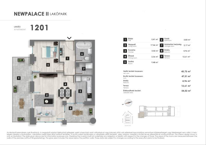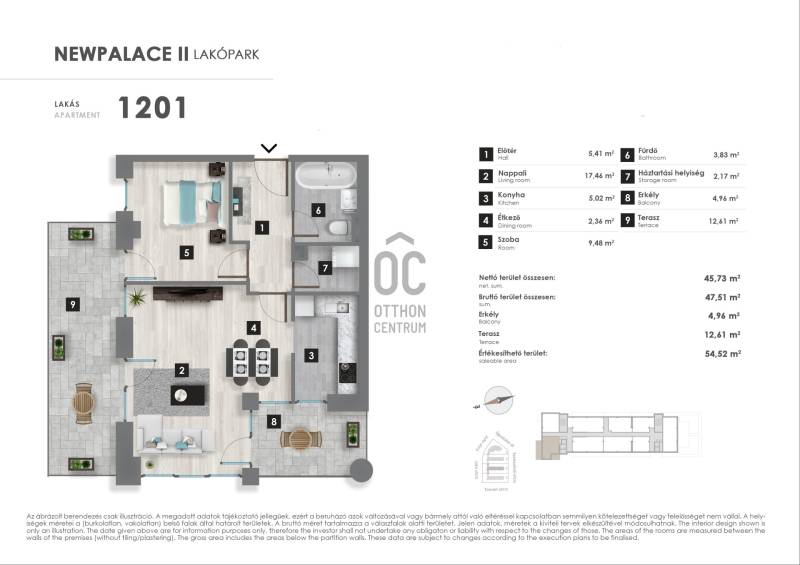 Projekt bemutatásaNew Palace II. ütemA New Palace a XIII. kerület csendes részén épül. A megújult kertvárosias környezet a pesti oldal egyik legkedveltebb részei közé tartozik, az itt élők egyszerre élvezhetik a csöndes kis utcák nyugalmát és a belváros közelségét.A társasház különleges, extravagáns homlokzatával egyedi fiatalos dizájnjával, kiemelkedik a környező épületek közül és ezáltal lesz majd sokáig a környék ismert és meghatározó tájékozódási pontja. A már eddig is komoly fejlődésen és megújuláson átesett városrész a projekt megvalósulásával beírja magát a kerület új városrészei közé.A földszint + 12 emelet magas épületet elegáns, kertépítők által tervezet parkok veszik körül, megreformálva a társasház környezetét is. A zárt, csak a társasház lakói által megközelíthető udvaron fákkal, cserjékkel tarkított, füvesített zöldkert kerül kialakításra.A lakások két elegáns, egymástól elkülönülő lobbyn keresztül közelíthetőek meg, lépcsőházanként két-két lifttel. A lakáskínálatban az egyszobás lakástól egészen a négyszobásig mindenféle elosztású megoldás megtalálható, a kínálatban alig van két egyforma lakás. Minden lakás rendelkezik erkéllyel vagy terasszal, a földszinti és néhány exkluzív emeleti lakás pedig, intenzív zöldtetővel, saját kertrésszel.Figyelembe véve a jövő elvárásait, a társasház modern, környezetbarát, mennyezeti hűtő, -fűtő rendszerrel ellátott.Vevőinknek lehetőségük nyílik arra is, hogy megvásárolt otthonukat az utolsó részletig személyre szabhassák: módosítással élhetnek otthonuk elosztása tekintetében is, továbbá széles kollekcióból választhatnak meleg- és hideg burkolatokat. Az alapáras burkolatokon felül, elérhetőek feláras termékek is, mely biztosítja, hogy személyiségük otthonukban is vissza tükröződhessen.Az infrastruktúra is magáért beszél: a közeli Váci út kiváló közlekedése és bevásárlási lehetőségei, a megújult 3-as metró Gyöngyösi utcai megállója rövid sétával elérhető, hasonlóan az idilli hangulatú Gyöngyösi sétányhoz, mely a kerület egyik legkedveltebb részei közé tartozik. Szintén pár perc sétatávolságra a folyamatosan megújuló és minden igényt kielégítő Duna Pláza bevásárlóközpont (benne: SPAR, gyógyszertár, Rossmann, DM, Médiamarkt, tisztító, fodrászatok, virágbolt, Libri könyvesbolt, papír-írószerbolt és számos ruházati bolt. Kényelmesen megoldható a napi fogyasztási cikkek beszerzése is a nap bármely órájában a közvetlen közelben lévő Tesco áruházban és az üzletsoron lévő boltokban. A lakópark tágabb vonzáskörzetében de még mindig elérhető távolságban találjuk Újpest-központot, a Népszigetet és az Újpest vasútállomást.Irodánkban a legtöbb XIII. kerületi beruházás lakásai elérhetőek ügyfeleink számára.A jelen adatok tájékoztató jellegűek, ezért a Beruházó (sem a hirdető) azok változásával, vagy bármely attól való eltéréssel kapcsolatban semmilyen kötelezettséget, vagy felelősséget nem vállal.Az alaprajzokon ábrázolt berendezési tárgyak és bútorok, a burkolatok megjelenése nem képezi a szerződés tárgyát. A pontos felszereltségről a műszaki leírásban olvashat bővebben.Az aktuális lakáskínálatról és árakról érdeklődjön telefonon!