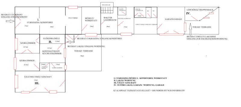 Marcali központjában, frekventált helyen eladó egy 449 m²-es, többfunkciósan használható ingatlanegyüttes, 1364 m²-es gondozott telken.A Balaton mindössze 13 km, az M7 autópálya 10 perc távolságra található.Az ingatlan kiváló választás vállalkozásra, befektetésre vagy többgenerációs családi otthonnak, mivel számos önálló egységet tartalmaz, valamint több bővítési lehetőséget is kínál.Főbb tudnivalók: •2 különálló lakórész•2 utcafronti üzlethelyiség, egyik jelenleg kiadható üzletként használható•Teljes berendezéssel rendelkező cukrászda vendégtérrel, műhellyel, pincével, raktárakkal•Dupla garázs + különálló garázs (összesen 3 beálló + több udvari parkoló)•Nagy, szépen gondozott, zöld kert•Ipari áram, gázfűtés, jó statikai állapotKülönlegességek és bővítési lehetőségek:•A tetőtér igény szerint beépíthető, korábbi tervek rendelkezésre állnak•A több külön egység miatt az ingatlan könnyen alakítható panzióvá, üzletközponttá vagy társasházzá•A cukrászüzem akár azonnal újraindítható, komplett felszerelésselLakóépület:•Tágas, világos terek•Konyha–étkező, kamra, nagy szobák, fürdő/WC•Fedett teraszkapcsolatKülön bejáratú tetőtéri lakás:•Esztétikus lépcsőház•97 m², amerikai konyhás nappali, háló, fürdő, tetőterasz•Minőségi belsőépítészeti megoldásokCukrászda / vendéglátó egység:•60 fős belső vendégtér•98 m²-es részben fedett terasz, akár 50 fő számára•Teljes technikai háttér: műhely, hűtőkamra, raktárak, pinceAz ingatlan per- és tehermentes, gyorsan birtokba vehető.A bútorzat és a cukrászüzem berendezése külön megállapodás alapján kérhető.Az alaprajz és az adatok tájékoztató jellegűek. RITKA LEHETŐSÉG A BALATONTÓL CSUPÁN 13 KILOMÉTERRE, AZ M7 AUTÓPÁLYÁTÓL 10 PERCRE. LEGYEN AZ ÜZLETI VÁLLALKOZÁS VAGY TÖBBGENERÁCIÓS CSALÁDI OTTHON, BEFEKTETÉSI LEHETŐSÉG További információval, megtekintéssel kapcsolatban várom hívását.