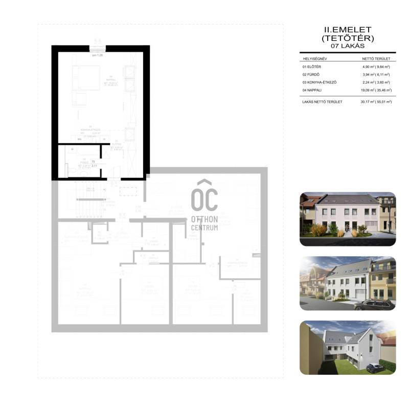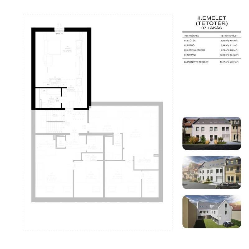 1 szobás 2 emeleti lakás foglalható ebben az új építésű társasházban!Válogasson kedvére a különböző méretű és elrendezésű lakások között.Legyen Ön a tulajdonosa egy új építésű, szép lakásnak!7 lakásos társasház egy 417 m2-es telekre épül Balmazújváros Belvárosában.34 m2 - 57 m2-es lakások leköthetőek 20%-os önerővel, 2026. január 15-ig még ezen az áron.A társasház főfalai 30 N+F falazó blokkal készülnek, külső felületen 15 cm vastagságú AUSTROTHERM AT-N100 hőszigeteléssel, vakolt felülettel.A külső nyílászárók műanyagok 3 rétegű üvegezésű ablakokkal, redőnyökkel.Az épület fűtése gázkazánnal történik, a melegvíz ellátása gázüzemű kazánnal történik.A lakásokban padlófűtéses hőleadás lesz, mért hőmennyiség mérővel történik az egyéni elszámolás.A vételár tartalmazza az 5%-os ÁFÁ-t!A társasház 3 garázzsal és 4 autóbeállóval tervezték, vásárlásuk kötelező! Az autóbeállók vételára 4 millió Ft, vagy garázs, mely 7 milliós árat képvisel.A hirdetésben szereplő 2. emeleti, lakás 30 m2 nettó / bruttó 55 m2-es (tetőtéri)Belső elosztása: előtér, konyha-étkező, nappali, fürdőszoba, kamraKulcsrakész ára : 38.300.000 FtA megbízható kivitelező, számos referenciával.Minden korosztály számára ideális választás!Tervezett műszaki átadás: 2026 év vége (hatósági átadás 2027. március)Az ingatlanra babaváró igénybevehető!A lakás az Otthona Start hitel által is finanszírozható min: 20%-os önerővel!További részletekért keressen bizalommal! Amennyiben a vásárláshoz hitelre van szüksége irodánkban teljes körű szolgáltatással várjuk!