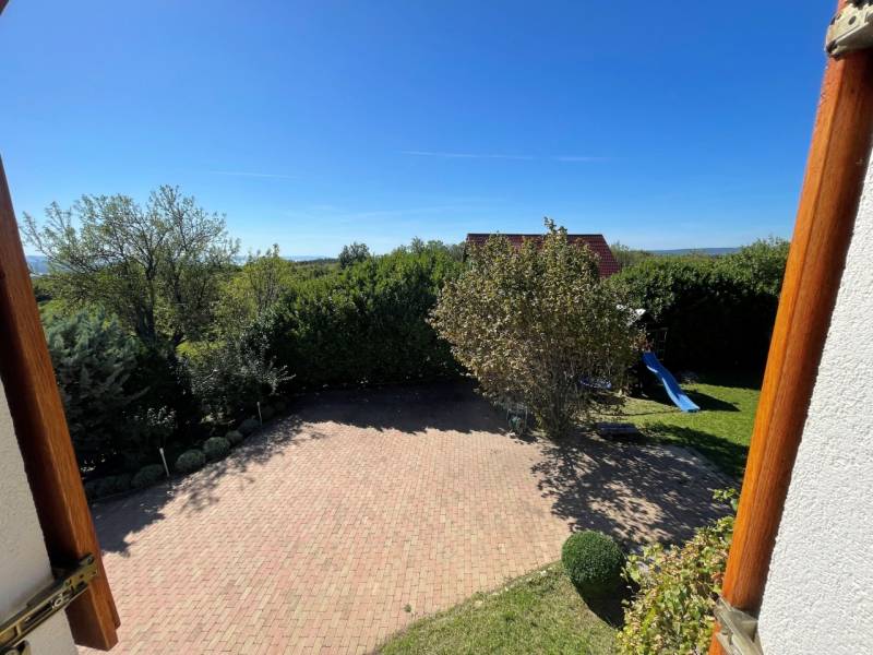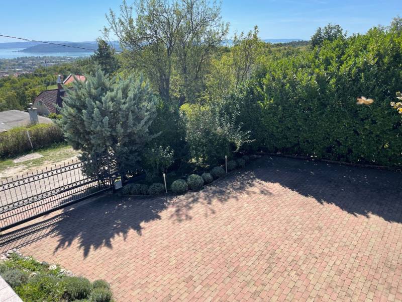 Panorámás szőlőhegyi ház Balatonfüreden – borospince, terasz, nagy telek!Balatonfüred csendes szőlőhegyi részén, 1868 m²-es telken eladó egy 158 m²-es kitűnő állapotú, igényes, Tihanyra néző panorámás ház téglaboltozatos borospincével, tágas terasszal, modern gépészettel és gondozott szőlővel. Az ingatlan Balaton-felvidék hagyományos stílusát és a kortárs építészet kifinomultságát ötvözi.Természetes, nemes anyagokból, helyi mesterek munkájával készült, így minden részlete a minőséget és tartósságot tükrözi.A ház a Balatonra nyíló panorámával és a természet nyugalmával ajándékoz meg, miközben Balatonfüred pezsgő élete néhány perc alatt elérhető.Főbb adatokHelyszín: Balatonfüred, szőlő besorolású telekTelek mérete: 1868 m² (gondozott szőlővel, díszkerttel, csúszdás mászókával, tágas parkolóval)Épület bruttó alapterülete: 158 m²Pince + földszint + tetőtér + borospince padlófűtés, extra radiátorok, sütőfunkciós cserépkályha, napkollektor – energiatakarékos kivitelPanorámás elhelyezkedés, természetvédelmi övezet mellettAz épületL-alakú, több szinten kialakított ház, tető- és homlokzatszigeteléssel, kettős hódfarkú betoncseréppel fedveTeljes alápincézés: tárolóhelyiség, infraszaunás, padlófűtéses fürdőhelyiség, gépészeti helyiségBorospince: földdel fedett téglaboltozatos, külön szellőzőkkel, tölgyfa ajtókkal, felülvilágítássalFöldszint: nappali + étkező (19,8 m²) + konyha (7,2 m² ) légtérben split klímával, vendégszoba (8,9 m²) + zuhanyzós fürdő (2,4 m²)Emelet: 2 hálószoba (20 és 10,2 m²) split klímákkal, sarokkádas fürdő (4,1 m²), külön WC (1,6 m²), tárolóKiegészítők: cserépkályha, infraszauna, félköríves terasz (25 m²), melynek burkolata felújításra szorul, így lehetőséget biztosítva a további egyéni igények kialakítására.Felszereltség és extrákViessmann gépészet: a tetőn elhelyezett napcellákkal a 705 l szünetmentes tápegységgel kiegészített puffertároló egész nyáron melegvizet, télen fűtésrásegítés funkciót biztosít.Fűtés: a föld alatti 5 m3-es propángáz tartály biztosítja a padlófűtést minden szinten, a nappaliban cserépkályha sütőfunkcióval, split klímák, a fürdőkben plusz törölközőszárító radiátorok.Nyílászárók: spalettás hőszigetelt tölgyfaablakok, mozgás-nyitásérzékelő riasztórendszerrel, kamerákkal.Szennyvíz: földalatti zárt szippantós.Kapcsolatok: meglévő UPC tányér és bevezetett telefonkábel, WIFI Extra: cserépkályha és infraszauna.Kert és telekTérkövezett parkoló, akár 5-6 autó részére1868 m² telek, melynek 80%-a gondozott szőlő (rizling, muskotály, csemegeszőlők)Vadkerítés, elektromos úszókapu, nagy parkoló világítássalCsepegtetőrendszer a díszkerthez, a szőlőben mozgásérzékelő reflektorok Játszótér: fa mászóka, csúszda, dupla hintaKerti tároló.ÁllapotÚjszerű, megkímélt állapotFolyamatosan karbantartvaEz az ingatlan tökéletes választás mindazoknak, akik Balatonfüreden keresnek nyugodt, panorámás környezetben épült, hivatalosan és szabályosan megépített gazdasági épületet, pince- és borospince-kapcsolattal, teljes infrastruktúrával, energiatakarékos gépészettel.