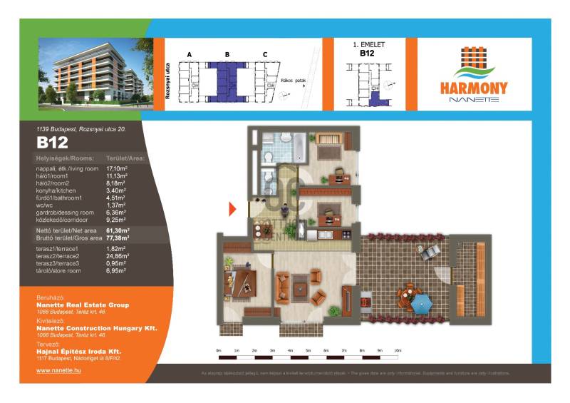 Kényelem és zöldövezeti nyugalom találkozik ebben a XIII. kerületi, Rozsnyay utcai otthonban. A 61 m²-es, amerikai konyhás nappalival és három hálószobával rendelkező lakás a családbarát elosztása és a tágas kültéri terei miatt egyaránt különleges.A LAKÁS JELLEMZŐI- nettó 61, bruttó 77 m² alapterület- amerikai konyhás nappali + 3 hálószoba- 25 m² nagy terasz, további két erkély- 7 m² tároló a teraszról nyílva- kádas fürdőszoba WC-vel- vendég WC kézmosóval- házközponti fűtés egyedi méréssel- légkondicionáló, redőny, szúnyogháló- gépesített konyha, szigetes konyhabútor- beépített szekrények, gardróbok- riasztó és biztonságos lakóparki környezetA HÁZ ÉS KÖRNYEZET- 2013-ban épült, liftes társasház- közösségi kerékpártároló a földszinten- rendezett és biztonságos, kamerarendszerrel felszereltKÖRNYÉK ÉS LOKÁCIÓ- a társasház közvetlen szomszédságában található a Rákos-patak sétánya futópályával, kerékpárúttal, sport- és játszóterekkel, kutyafuttatóval- a Vasas sporttelep néhány lépésre elérhető- bevásárlási lehetőségek (Duna Plaza, LIDL, ALDI, Tesco, CBA) pár perc távolságra. A közlekedés kiváló, M3-as metrómegálló és több buszjárat gyorsan elérhetőPARKOLÁS- a lakáshoz tartozik egy teremgarázs hely, amely megvásárolandó 7 millió forintért- könnyen parkolható, biztonságos helyet kínál az autójánakEZ AZ OTTHON IDEÁLI VÁLASZTÁS:- családoknak, akik értékelik a több hálószobás elosztást,- sportos, aktív életmódot kedvelőknek,- kutyásoknak és természetkedvelőknek, akik közvetlenül a zöldövezet mellett szeretnének élni.A lakás azonnal költözhető, igényes kialakításának és tágas teraszainak köszönhetően igazán különleges otthont kínál a XIII. kerület egyik legjobb részén.Várom hívását a hét bármely napján!Ez az ingatlan a \"Hűség csomag\" megbízási portfólióhoz tartozik. Részletek az Otthon Centrum weboldalán.