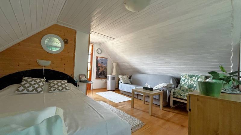 A Tapolcától és a Balatontól is 5-5 kilométerre lévő, mintegy 1000 lakosú Nemesgulács a Tapolcai-medence déli részén, a Gulács nyugati tövében fekszik. A Balaton-felvidéki Nemzeti Parkhoz tartozó tájat ez a 393 méter magas bazaltvulkáni tanúhegy uralja, melyet cukorsüvegnek is neveznek,a hegyről gyönyörű kilátás nyílik a Tapolcai-medencére a Balatonra és a Keszthelyi hegységre.Az erdő ölelésében megbúvó mesebeli házikó várja új tulajdonosát.A háromszintes épület 80 nm lakótérrel és 46 nm teraszkapcsolattal rendelkezik.Földszint :- hálószoba, konyha-étkező, fürdőszoba ,terasz, elosztással.Emelet :- hálószoba, konyha-étkező, fürdőszoba, terasz.Tetőtér:-belső lépcsős kialakítással egy légterű lakrész,gardrób,fedett terasz mesés Balatoni és tájpanorámával.A ház ,két önálló lakrészre tagolódik, külön bejárattal megközelíthető.Az otthon melegét fatüzelésű kandalló biztosítja.Villany bevezetve, a vezetékes víz bevezetése folyamatban van, jelenleg a ház vízellátása víztárolóból megoldott.Az épület folyamatosan karbantartott, kiváló állapotban kerül értékesítésre.A kertben szerszám és fatároló is található.Kültéri étkező, épített grill, nagyméretű, panoráma terasz , áll a lakók rendelkezésére.A gondozott, dísznövényekkel , termő gyümölcsfákkal betelepített kert 1541 nm területtel rendelkezik.Az épület minden szintjéről lélegzetelállító panorámát élvezhetünk.Aszfaltos úton át, minden évszakban jól megközelíthető, az autók parkolása a ház mellett megoldott.A külterületi házikó kifüggesztési eljárást nem igényel, rövid határidővel birtokba vehető.A tulajdonos, a nyaralót teljes berendezéssel együtt kívánja értékesíteni, ezt a vétel ár tartalmazza.A mesés panoráma ,a varázslatos környezet, igazi szabadság életérzést nyújt ,egyre többen emlegetik csak magyar Provence-nak a Balaton Felvidék területét.Ajánlom ezt a kisbirtokot, hétvégi házként mindazoknak, akik csendre, nyugalomra vágynak, akik a nagyváros zaját hátrahagynák hétvégente és a szabadságuk idejére a vidéki élet békéjét választva pihennének, kikapcsolódnának.Ha felkeltette az érdeklődését,hívjon bizalommal a hét bármely napján!