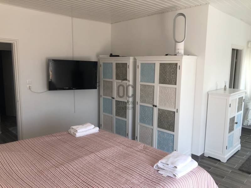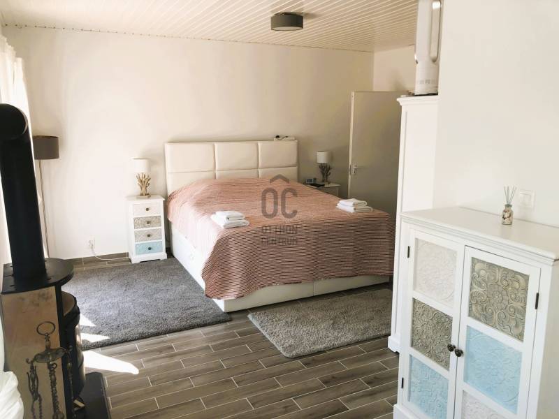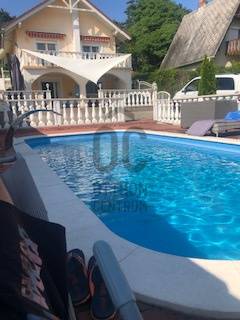 A BALATON ÉSZAKI PARTJÁN, VONYARCVASHEGYEN CSENDES KÖRNYÉKEN, NYUGODT KÖRNYEZETBEN ELADÓ PANORÁMÁS, TÖBB FUNKCIÓS CSALÁDI HÁZ ÚSZÓMEDENCÉVEL. AZ OTTHON CENTRUM KIEMELT AJÁNLATA.Az ingatlant biztonságos, kedvelt kicsi zsákutcában találjuk. Pontosan illik rá a település szlogenje: \" Mögöttünk az erdő, előttünk a víz.\" A telek 714 m2, nagyrész térkövezett, könnyen karbantartható. A ház két szintes, hatalmas terasszal, erkéllyel, ahonnan a Balaton tükrében is gyönyörködhetünk. Megbízható minőségben épült 2003-ban, néhány éve modernizálták, alakítottak a használati beosztáson.További jellemzői: - Összközműves tégla épület, cserép fedéssel. Műanyag nyílászárók. - Gáz cirkó fűtés, + két hangulatos kandalló -4 hálószoba, 3 fürdőszoba nagyobb családnak is kényelmes elhelyezést biztosít. - A nettó lakótér 120 m2, ami nem foglalja magában a teraszokat, erkélyt, tárolókat. - Helyiségek: A földszinten teraszkapcsolatos nappali, egy légterű, de szaperált modern konyhával, étkezővel. Kis közlekedőből nyílik egy fürdő, tágas hálószoba és a lépcsőfeljáró. A felső szintre belül, és külső lépcsön is fel lehet jutni. Itt három hálószobát, zuhanyzós és kádas fürdőszobaát alakítottak ki. A déli tájolású legnagyobb hálóból panoráma erkély nyílik. A ház mögött két méretes tároló, elektromos távirányítós záróredőnyokkel. Elektromosan vezérelt kapu. Mivel a két szint külön bejárattal is rendelkezik, két generáció lakhatására, nyaralására, kiadásra is alkalmassá tehetó. Befektetésnek szintén kiváló ajánlat.A ház teljes berendezéssel. felszereléssel kerül értékesítésre, amit a vételár tartalmaz. Vonyarcvashegyet a Keszthelyi-hegység öleli körül, erdőivel, szőlőültetvényeivel, árnyas pincéivel, benne sajátos ízvilágú boraival. Ötcsillagos Lido strandja számos alkalommal érte el a Balaton legszebb, legsportosabb strandja kitüntető elismerést. A környék jellegzetessége a Csándor-hegy tetején álló Kálvária út és a végén a 2010-ben felszentelt 7,38 méter magas Fénykereszt. A Balatonból kiemelkedő egykori dombsziget, a 136 méter magas Szent Mihály domb. Tetején áll a 40 jéghalász megmenekülése emlékét őrző Szent Mihály Fogadalmi Halászkápolna, mely Magyarország, sőt a tengerparttal nem rendelkező országok egyetlen Halászkápolnája. Ez a csodás fekvésű, romantikus hangulatú szakrális hely megigézi az idelátogatókat. A hosszú évszázadok múltját őrző kápolna Vonyarcvashegy jelképévé vált.Ha felkeltette érdeklődését a fenti ingatlan, további kérdései vannak, megtekintéshez időpontot egyeztetne, kérem, hívjon, írjon a megadott elérhetőségeken.