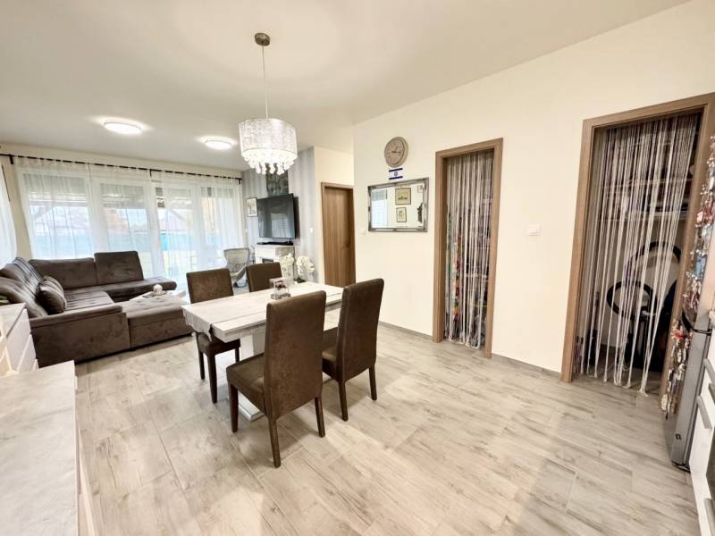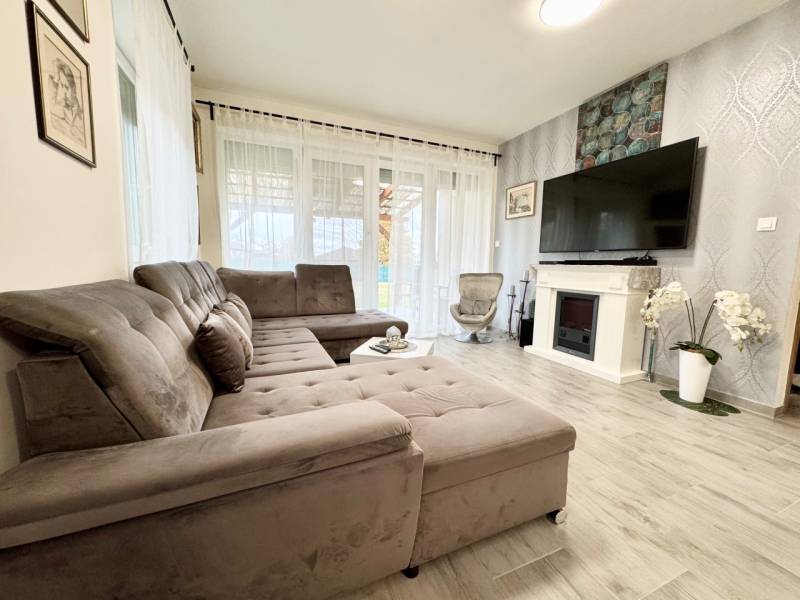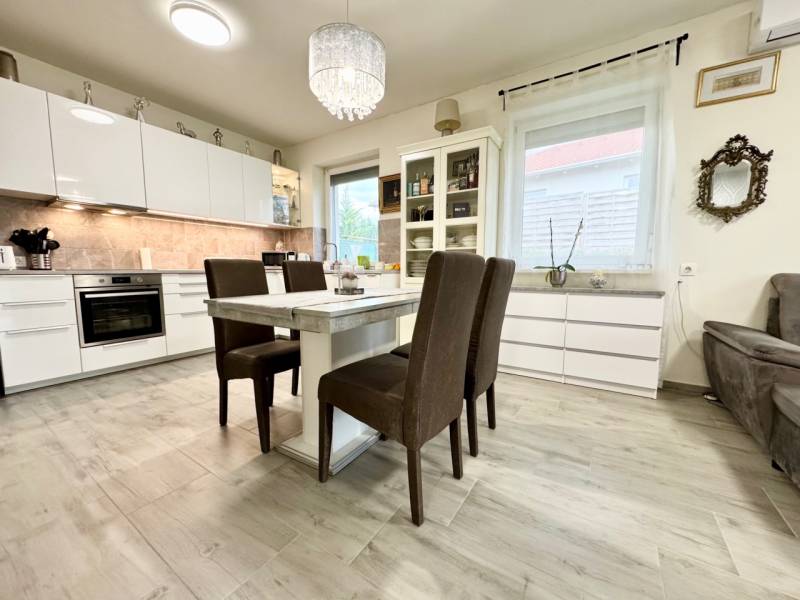 Budapest és Esztergom között a pilisi hegyek ölelésében található hangulatos településen, Pilisjászfalun újonnan, a Somlyó völgyi lakóparkban, csendes jelenleg még murvával borított összközműves mellékutcában, 800 nm-es saját kerttel rendelkező, 2020-ban épült, szigetelt, egyszintes, 71 nm-es lakóterületű, nappali + 3 háló szobás, amerikai konyhás, kamrás, közvetlen kert-teraszkapcsolatos, kiváló elosztású, külön nyíló szobás, napos-világos D-NY-i fekvésű, alacsony fenntartású, modern, kondenzációs gázkazán fűtésű, újszerű állapotú, klimatizált, riasztórendszerrel felszerelt ikerház fél, beépített, gépesített konyhával, 2 gépkocsi számára alkalmas felszíni gépkocsi beállóval, 8 nm-es kerti tárolóval, gondozott kerttel, eladó.A környék abszolút biztonságos, infrastruktúrája és közlekedése kitűnően ellátott.Budapest belváros (Nyugati pályaudvar) kényelmes közlekedéssel 1 óra alatt elérhető. Pilisjászfalui vasútállomás 1 km-re. A Budapest Árpád híd-Esztergom vonalon közlekedő 800-as autóbusz megállója 1,5 km-re. A településen található: bölcsőde, óvoda, általános iskola, háziorvosi rendelő, posta, élelmiszerbolt, játszótér, sportolási lehetőségek. Ajánljuk mindazoknak, akik egy kellemes hangulatú, emberléptékű házban szeretnének lakni, távol a város nyüzsgő forgatagától, tiszta levegőre, nyugalomra vágynak, de mégis Budapest vonzáskörzetében maradnának.Érdemes megnézni!További információkért és a megtekintéssel kapcsolatban várom megtisztelő hívását! (hétvégén is)EA