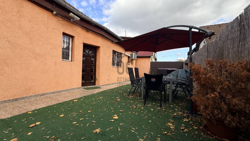 Otthonos családi fészek privát kerttel Soroksár egyik csendes utcájában.Ez a rendkívül jó elosztású ingatlan ideális választás családoknak vagy akár befektetőknek is, hiszen a külön nyíló helyiségek lehetővé teszik a kényelmes együttélést.Fűtés kombi cirko gázkazánnal megoldott radiátorokkal, azonban a kővel burkolt szobában a melegről padlófűtés gondoskodik, a házban a további kényelem miatt két komplett fürdőszoba is kialakításra került. A szobákban a legtöbb ablakon reluxa is van.A konyhában külön víztisztító rendszer is kialakításra került.2010-ben cserélték a vízvezetéket, a nyílászárókat és a kazánt Saunier Duval gázkazánra, 2018-ban a ház újabb felújításon esett át, ekkor kicserélték a villanyvezetéket, és megújították a belső kialakítást, burkolatokat, bútorzatot is.A ház falazata vegyes tégla és vályog, kívülről a ház a szellőzés érdekében kőzetgyapot szigetelést kapott, a födém pedig fa gerendás, üveggyapot szigeteléssel.A kert önálló, saját használatú, külön kerítés választja el a szomszéd házaktól, így senki nem megy át rajta!A biztonságról és a kényelmes bejutásról elektromos kapu gondoskodik.Pár perces sétával megközelíthető a tömegközlekedés illetve a közeli Hősök terén bevásárlási lehetőségek, óvoda és iskola is megtalálható.Budapest, 23. kerület, Soroksár eladó sorház tégla vegyesfalazat 4 szoba felújított 2 klíma