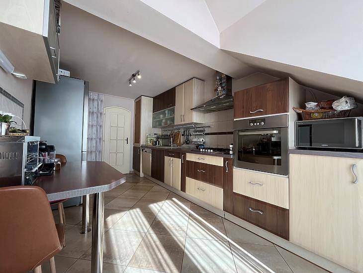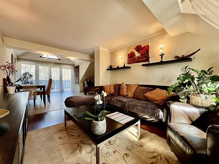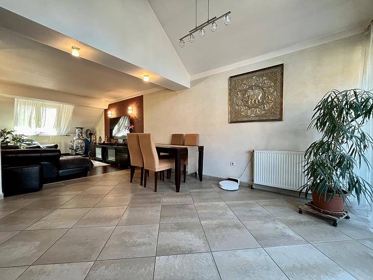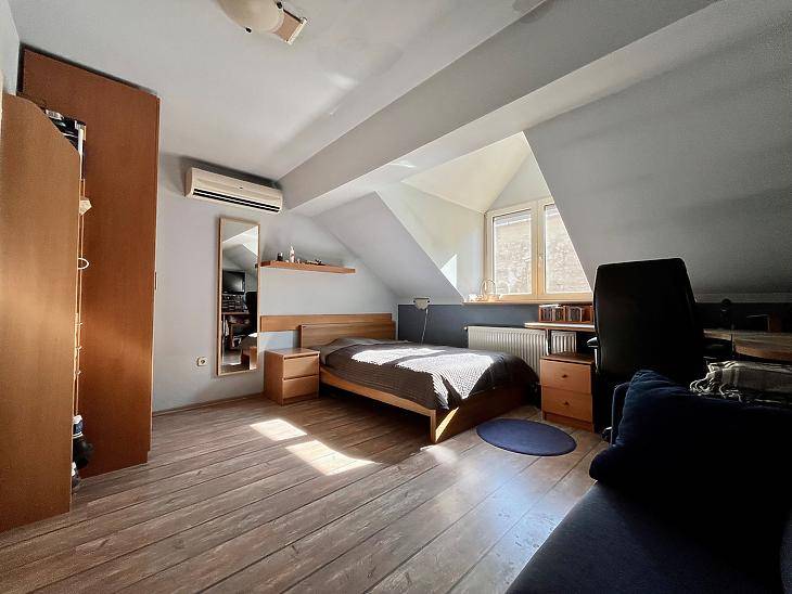 Eladó tágas tetőtéri lakás Újlak csendes, zöldövezeti részénA Kolosy tér és a Hármashatár-hegy közelében, egy hangulatos, macskaköves utcában kínálunk eladásra egy 148 m²-es, második emeleti tetőtéri lakást, egy négylakásos házban. A környék folyamatosan fejlődik, szemben lévő épületet épp felújítják, a közelben sportpálya is található.A lakás 3 különnyíló szobával rendelkezik (14, 16 és egy 33 m²-es nappali), utóbbiból közvetlen kijárat nyílik a napfényes, 10 m²-es teraszra. A konyha tágas, kamrával és francia erkéllyel. Külön fürdő, két WC, gardrób, valamint saját padlás és tároló is tartozik hozzá. A hálószobák klimatizáltak, a nappali igény esetén könnyen kettéosztható, így akár egy plusz szoba is kialakítható. A lakáshoz kizárólagos kertkapcsolat is jár.A ház használati megosztással rendelkezik, a társasházzá alakítás folyamatban van. Ritka lehetőség a környéken, ahol már szinte csak nagyobb társasházak találhatók, de a lakás jelenlegi állapotában is hitelezhetőHa egy napfényes, nyugodt, jól megközelíthető otthont keres Budán, ez a lakás remek választás. További információért, megtekintésért keressen minket bizalommal.