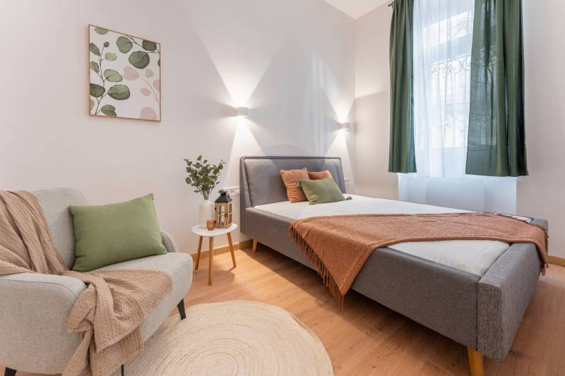 V. kerület közkedvelt részén, Vígszínháztól és a Jászai Mari tértől pár lépésnyire eladó egy teljes körűen felújított, 51 m²-es, nappali + 2 hálós lakás.A lakás egy gyönyörű, liftes ház 1. emeletén található. Az épület történelmi hangulatot áraszt.Főbb jellemzők:• kiemelt lokáció, mégis csendes lakás• a kisebbik hálóhoz saját gardróbhelyiség tartozik• tágas, világos amerikai konyhás nappali és gépesített konyha• külön fürdő, külön mellékhelyiség• teljes berendezés az árban – a bútorzat igény szerint cserélhető• beépített gardróbszekrények igény szerinti elkészítése benne van az árbanA környék kiemelkedően jó infrastruktúrával rendelkezik: éttermek, kávézók, mozi, fitneszterem, bevásárlási lehetőségek mind pár perc sétára elérhetők, a közlekedés pedig kiváló (M3-as metró, 4-6 villamos, számos troli és buszjárat).