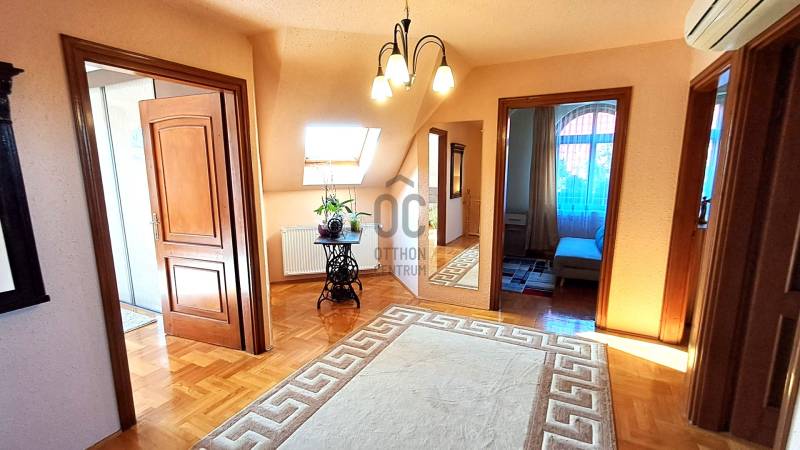 Debrecen, Felsőjózsa, Északi soron eladó egy igényes, 163 nm-es, 2003-as építésű családi ház 1246 m2-es telken. A földszinten nappali-étkező-konyha, 1 szoba, WC-s fürdőszoba, kamra és egy másik konyha van, az emeleten a közlekedőből nyílik 3 szoba, gardrób, fürdőszoba és külön WC.Jellemzők:--2 egyedi tervezésű konyha beépített gépekkel--a földszinten zuhanykabinos, az emeleten hidromasszázs sarokkádas fürdőszoba dupla mosdókagylóval--gardrób szoba, beépített szekrények--riasztó rendszer, inverteres klíma--a nappaliban fűtött padkás cserépkályha--fűtés gáz és vegyes tüzelésű kazánnal is lehetséges--38 cm-es tégla falazat 5 cm hőszigeteléssel--23 m2-es aknás, fűthető garázs, a térkövezett udvaron 5 db gépkocsi parkolására van lehetőség-- 2005-ben épült 42 nm-es téglaépület, mely iroda, műhely, tároló szerepet is betölthet--a kertben van egy fa szerkezetű filagória, búboskemencével, bográcsozóval, kinti konyhával és étkezőhellyel-- 6x3 m-es, 110 cm mély, fedett medence, vízforgató- és szűrő berendezéssel--szépen füvesített, örökzöldekkel, gyümölcsfákkal beültetett kert, mely automata öntözőrendszerrel, fúrt kúttal ellátott. Az ingatlan per-, tehermentes, nyilvántartása rendezett, minden épület fel van tüntetve térképmásolaton. A rezsi alacsony, a ház igény szerint, akár teljes bútorzottal is eladó. A lakóház rendezett, nagy értékű ingatlanokkal beépített utcában van, kiváló szomszédokkal.Debrecen-Józsa élhető, családias hangulatú, kiváló infrastruktúrájú városrésze Debrecennek: a Józsa-Park bevásárló központ, spar, tesco, piac, fagylaltozó, iskolák, óvodák a közelben vannak.Debrecenig kiépített bicikliút van, autópálya felhajtó pár perces autóútra található.További információkért, illetve időpont egyeztetéséért keressen elérhetőségeimen!
