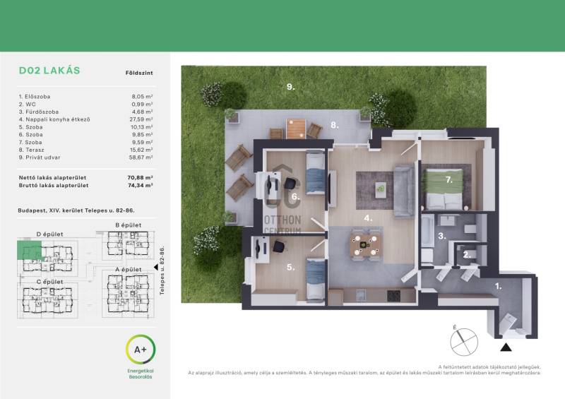 Projekt bemutatásaA Daisy Liget Zugló csendes részén épül, közel a Bosnyék térhez. A megújult kertvárosias környezet a pesti oldal egyik legkedveltebb részei közé tartozik, az itt élők egyszerre élvezhetik a csöndes kis utcák nyugalmát és a belváros közelségét. A Bosnyák téren mindent megtalálunk ami a hétköznapi élethez szükséges: a Zenit corso bevásárlóközpontot, a Bosnyák téri piacot, patikát, éttermeket és kávézókat.Számos óvodát, általános iskolát, játszóteret és sportközpontot is találunk a 10 perces sétatávolságon belül.A társasház különleges homlokzatával, egyedi fiatalos dizájnjával, kiemelkedik a környező épületek közül. A 4 emelet magas, szellősen elhelyezett épületek tökéletesen illeszkednek a környéken jellegzetes, előkertes kialakítású épületekhez.Figyelembe véve a jövő elvárásait, a társasház modern, környezetbarát, mennyezeti hűtő, -fűtő rendszerrel ellátott.Vevőinknek lehetőségük nyílik, hogy új otthonukat az utolsó részletig személyre szabják: változtathatnak az ingatlann elosztásán, széles kollekcióból választhatnak meleg- és hideg burkolatokat, szanitereket. Az alapáras burkolatokon felül, elérhetőek feláras termékek is, mely biztosítja, hogy olyan lakásban lakjanak mit megálmodtak maguknak.A fizetési ütemezés: 10-90%A jelen adatok tájékoztató jellegűek, ezért a Beruházó (sem a hirdető) azok változásával, vagy bármely attól való eltéréssel kapcsolatban semmilyen kötelezettséget, vagy felelősséget nem vállal.Az alaprajzokon ábrázolt berendezési tárgyak és bútorok, a burkolatok megjelenése nem képezi a szerződés tárgyát. A pontos felszereltségről a műszaki leírásban olvashat bővebben.Az aktuális lakáskínálatról és árakról érdeklődjön telefonon!