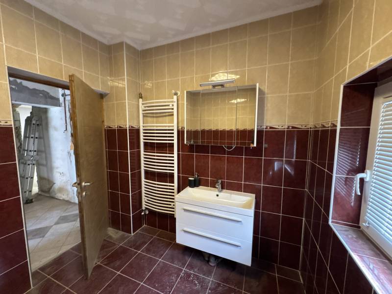 Eladó felújítandó családi ház Erdőkertesen, jó elosztás, garázs, napelem!Alapterület: 76,37 m² + 34 m² fedett teraszTelek: 675 nmSzobák száma: 2 szoba + konyha + fürdő + tárolóÁllapot: Teljesen felújítandóFűtés: egyedi (korábbi radiátorok részben megvannak)Parkolás: 2 állásos garázs elektromos kapuvalExtrák: napelemrendszer, beépített terasz, tágas kertLeírás:Erdőkertes csendes, zöldövezeti részén eladásra kínálunk egy 76,37 m²-es, kisméretű téglából épült családi házat, mely teljes belső felújítást igényel.Az ingatlan 2 szobából, konyhából, fürdőszobából, egy kis tárolóból, valamint egy fedett 34 m²-es teraszból áll. A mellékelt fotók jól mutatják az ingatlan jelenlegi állapotát, ami a kreatív vevők számára átalakítási szabadságot biztosít.A házhoz tartozik egy tágas, kétállásos garázs, mely elektromos kapuval rendelkezik. A garázs falai dekoratív bontott téglával burkoltak, a tetőszerkezet újabb, és a tér világos, rendezhető.A konyha és a szobák jelenleg bontott állapotban vannak – részben vakolatlan falak, új mennyezeti világítás, részben új nyílászárók és burkolat nélküli padló jellemzi őket. A konyhában néhány beépített elem már megtalálható.A hátsó kert gondozásra vár, de kiváló adottságokkal rendelkezik: zöld, napos, több gyümölcsfával és bokorral, valamint egy kis veteményes vagy játszótér is könnyedén kialakítható.További jellemzők:TéglaépítésűNapelemrendszerElektromos garázskapuRészben új nyílászárókFedett teraszCsendes, kertvárosi környezetFelújítóknak, befektetőknek ideálisKiknek ajánljuk?Felújításban gondolkodóknak, akik saját ízlés szerint alakítanák ki otthonukatBefektetőknek, akik értéknövelésben és kiadásban is gondolkodnakCsaládosoknak, akik szeretnének kertes házba költözni elérhető áron