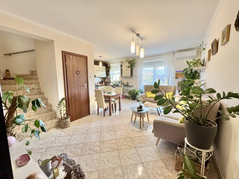 Eladóvá vált Fót, egyik legszebb részén, Királydombon, egy bruttó 110 nm-es, nettó 102 nm-es, 4 szobával+1 nappalival rendelkező, 2 fürdőszobával +1 mellékhelyiséggel, kamrával kiegészített, 200 nm-es telken húzódó, 2 teremgarázshellyel+1 nyitott kerítésen kívüli parkolóhellyel, 3 db tárolóval rendelkező, középső sorházi lakás!Az ingatlan 2011-ben épült, jelenlegi tulajdonosa és családja, 2017 óta lakják. A kert, évszaknak megfelelően, folyamatosan karbantartott, rendezett, kiépített locsoló rendszerrel rendelkezik, de jelenleg ez nincsen használva. A kert végében kialakításra került egy kis fedett sütögetőhely, ami ideális választás lehet családi beszélgetésekhez. Kiemelendő, hogy a kerti szerszámokat nem a lakáson kell keresztül cipelni, mivel a garázs, ami a teljes ház alatt húzódik, átjárást biztosít a kert felé. Számos pakolási, raktározási, tárolási lehetőséggel kiegészítve.A házba belépve, egy ideális méretű előszobába érkezünk, ahonnan egy vendégmosdó nyílik, jelenleg, mosókonyhának van használva, de egy újabb, zuhanyzós fürdőszobát is ki lehet belőle alakítani. Tovább haladván, az amerikaikonyhás-nappaliba érkezünk, ami közvetlen terasz kapcsolattal rendelkezik. A lépcső alatti területet kamraként hasznosítják, így a befőtteknek is van helye, Sok sorházi lakással ellentétben, itt a földszinten is van egy szoba, ami jelenleg dolgozószobának van kialakítva, de akár vendégszobának, hálószobának is használható. Az emeleten, a szülöi hálószoba, saját, zuhanyzós fürdőszobával rendelkezik, valamint a gyerekeknek is kialakítottak egy kádas fürdőszobát. A két másik szoba, közel azonos méretű, közös erkéllyel rendelkeznek. A bútorozást megkönnyítve, egy gardrób is helyet kapott előtérben. A kellemes hőérzetről gázcirkó gondoskodik, továbbá egy-egy db klíma került felszerelésre. A nyílászárók redőnnyel, illetve szúnyoghálóval ellátottak.A környék barátságos, családias, a közelben számos bevásárlási lehetőség, iskola, óvoda, bölcsőde, orvosi rendelő található, továbbá buszmegálló, vasútállomás 10 perc alatt elérhető.Ajánlanám ezt az ingatlant olyanoknak, akik nem szeretnének nagyobb felújítással foglalkozni, valamint Fót egyik legszebb, családias részén élnének, valamint olyanoknak, akik nem szeretnének órákat utazni a munkahelyükre.A ház megvásárlásához a megfelelő önerővel „már rendelkező”, de ezenfelül akár ***banki hitelfelvétellel, akár *** CSOK+ , akár ***lakáskassza megtakarítással és akár a ***babaváró program keretében felvehető / felhasználható pénzösszegből vásárló személyek megkeresését is szeretettel várom!Ha a leírtak és a látottak alapján felkeltettem az érdeklődését, keressen bizalommal akár hétvégén is!***Az igénylési / felhasználási feltételekkel kapcsolatban, valamint ezek ügyintézésben is, az Otthon Centrum hitelközvetítő munkatársával együtt, készséggel állok az Ön szíves rendelkezésére!