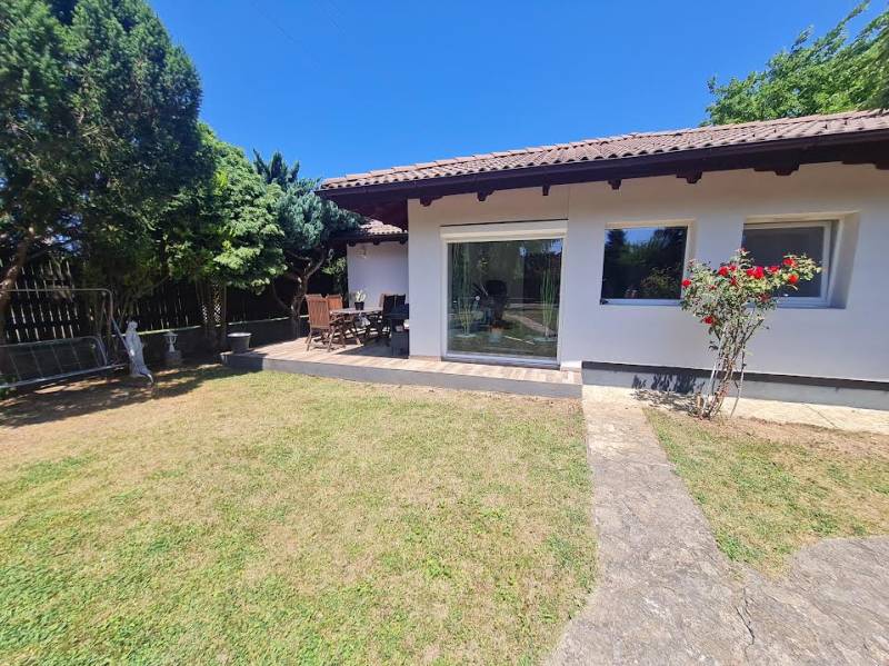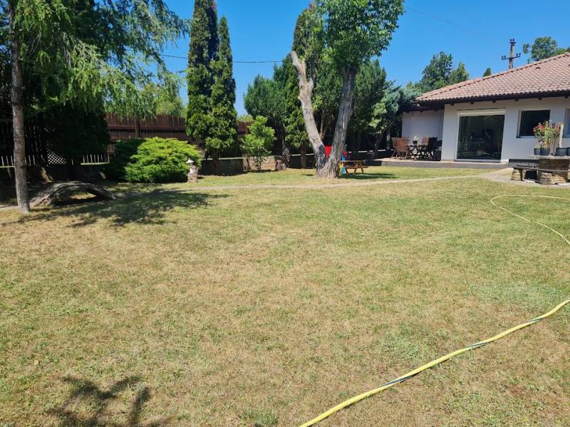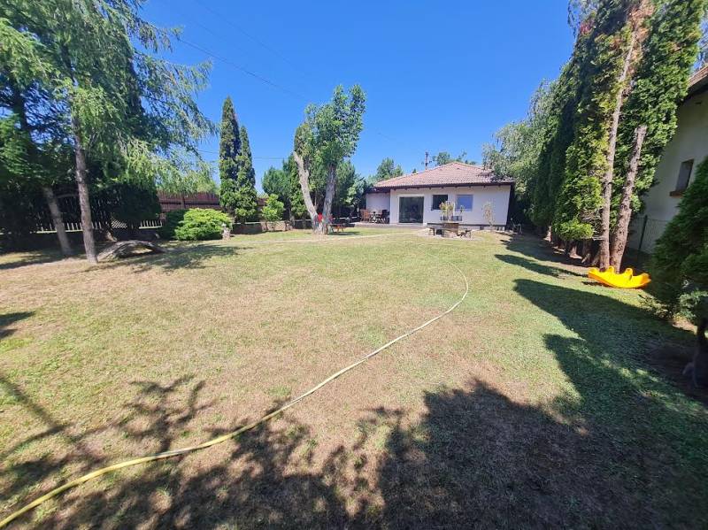 Pomázon gyönyörű környezetben nagy 654 m2-es összközműves sík telken eladó ez a földszintes, 2000-ben épült 4 szobás önálló családi ház.5 m-es belmagasságú, a mennyezet igényes faburkolatú.Az amerikai konyhás nappali terasz és kertkapcsolatos, ebből nyílik a 3 hálószoba és a fürdőszoba. Külön kamra, szép terasz és fedett kocsibeálló, és kerti sütögető tartozik még a házhoz.A nappaliban hűtő-fűtő légkondicionáló berendezés van, a ház fűtése gázkazánnal történik, padló és radiátoros fűtéssel.A gázátalány 20.000 Ft/hó, a ház teljes rezsije kb. 45.000 Ft.Műanyag 3 rétegű nyílászárók lettek beépítve szellőztetővel, 15 cm-es szigetelés van a házon.A konyhabútor igényes, sok elemes, konyhasziget is tartozik hozzá.A ház tehermentes, 1/1 es tulajdonú..A telek nagysága miatt a ház elé igény szerint egy gyönyörű medence építhető.