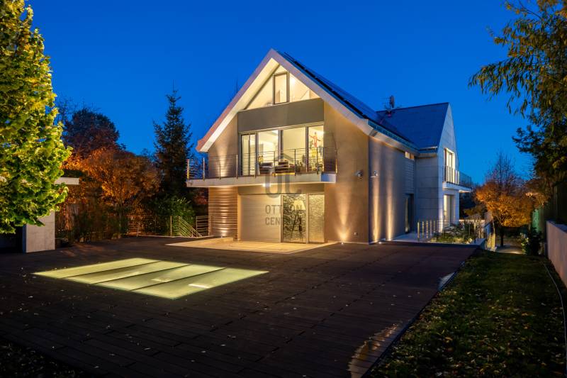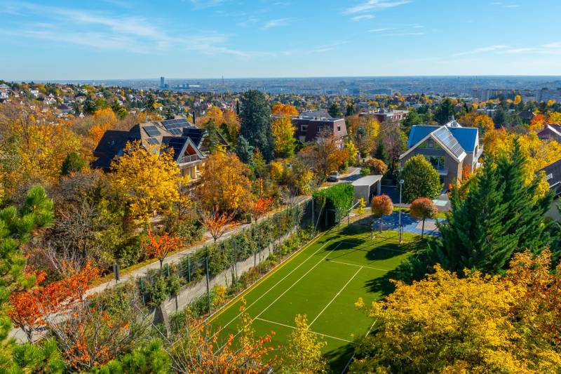 Technológiailag előremutató, anyaghasználatában időtálló, élményében családbarát villa.Üdv itthon!RÖVID ÖSSZEFOGLALÓA XII. kerület erdőszegélyén, dombtetőn áll ez a 775 m²-es, négyszintes, déli tájolású családi villa egy ~2200 m²-es telken.11 szoba, 5 fürdő, 3 külön mosdó, tágas közösségi zónák, privát wellness és fitneszterem; a kertben saját teniszpálya és kosárlabdapálya, reflektorvilágítással.Technológia: geotermikus hűtés–fűtés (szondás hőszivattyú), padló- és falfűtés, falhűtés, hővisszanyerős szellőztető rendszer, napelemek és napkollektorok, továbbá okosotthon-rendszer, beépített multiroom hangrendszer, kamerarendszer és riasztó a legmagasabb fokú biztonság érdekében, valamint lift a kényelmes, energiatudatos mindennapokhoz.ELHELYEZKEDÉS ÉS KÖRNYEZETA ház Sasad fölötti, zöld, panorámás övben található: csend, tiszta levegő és erdőközeli miliő, mégis gyors városi elérés.Autóval a Széll Kálmán tér mindössze 7–8 perc, a MOM Park 10–15 perc alatt elérhető.Kelenföld és az M1/M7 autópálya-felhajtó rövid, logikus útvonalon közelíthető meg, így a Balaton is alig egy óra alatt elérhető.A mindennapi infrastruktúrát a Hegyvidék Központ, a környék delikátjai és kispiacai adják; hétvégén a Normafa–Tündérhegy vonal kínál sétát, sportot, kilátást.Családoknak kiemelkedő az iskolai kínálat: British International School, Osztrák Iskola, több magánóvoda és sportegyesület ésszerű távolságon belül.AZ ÉPÜLET, - A MESTERMŰA villa megújulása Bényei István, Ybl- és Pro Architectura-díjas építész nevéhez fűződik, akinek munkásságát a kortárs letisztultság, a precíz arányérzék és a természetes anyagok iránti tisztelet jellemzi.A Lidérc utcai ház az ő építészeti gondolkodásának esszenciája: a fény, a kő és a tér párbeszéde – egy otthon, amely egyszerre kortárs és időtálló.A 2014-ben befejezett felújítás során a cél az volt, hogy a korábbi struktúrát megnyitott, áramló terekkel, nagy üvegfelületekkel és a táj látványát beengedő homlokzati arányokkal alakítsák újjá.Az eredmény egy építészeti mű, amelyben a Jura mészkő, a bolgár zöld–fekete kvarcit, valamint a lépcsőrészen alkalmazott brazil arany kvarcit a meleg diófa felületekkel együtt olyan karaktert és időtálló eleganciát adnak a háznak, amely ritkán található meg a budapesti kínálatban.A finom részleteket Solinfo olasz designlámpák emelik ki, a beépített bútorokat pedig a Ligno Art készítette egyedi megrendelésre.A nyílászárók 7 kamrás, háromrétegű reflexiós üvegezésű rendszerek, amelyek kiemelkedő hő- és hangszigetelést biztosítanak.A borozó ajtaja és bútorzata Ázsiából származó, több mint százéves hajófa anyagból készült, eredeti viaszolt felülettel megőrizve.Az étkező ikonikus darabja a lávakőből készült asztal, amely acél állványon nyugszik, tömege meghaladja a fél tonnát.A házhoz két garázs és több felszíni beálló is tartozik, így a parkolás elegánsan, kényelmesen megoldott.AZ OTTHON BELSŐ VILÁGAMeleg elegancia és természetes harmónia: travertin, dió, puha textúrák és nagyvonalú arányok.A nappali padlótól mennyezetig futó üvegezése a panorámát a tér díszévé emeli; a mély ülésű kanapék köre beszélgetésre és elcsendesedésre egyaránt hív.A terasz a belső tér természetes folytatása: vasárnapi ebédek, esti borozások, aranyló lombkoronák.A konyha–étkező a ház szíve: letisztult frontok, tömör dió sziget, rejtett tárolók és prémium gépek.Itt keveredik a reggeli kávé illata a gyerekek nevetésével; minden részlet a családi ritmust szolgálja.A felső szinteken világos gyerekszobák és tágas hálók sorakoznak.Nem csupán kilátás, hanem élmény: térben, fényben, biztonságban lehet felnőni; a színek nyugalma és az arányok természetes tanulási–játék–pihenő közeget teremtenek.A szülői lakrész külön univerzum: kétoldali gardrób, privát terasz és szobaméretű, panorámás fürdő, ahol kő, fény és víz időtlen egységet alkot.A wellness-szint a feltöltődés tere: mozaikos, virágmotívumos medence üvegtetővel, szauna, jacuzzi, pihenőtér és Technogym-gépekkel felszerelt fitnesz.A nagy üvegfelületeknek köszönhetően az alsó szint is fényben gazdag; itt található a borospince, a családi játéktér, és az üvegfelületek mögött egy kis japán kert, amely tovább fokozza a nyugalom és harmónia érzetét.A KERT ÉS A SAJÁT SPORTPÁLYÁKA minőségi idő és az egészséges életmód itt a mindennapok természetes része.A tágas, parkosított kertben két különleges érték kapott helyet: egy teljes méretű teniszpálya és egy saját kosárlabdapálya, reflektorvilágítással.Ilyen lehetőség ma már szinte egyedülálló Budapesten – az új szabályozások miatt újonnan ilyen pályák építése gyakorlatilag nem engedélyezett.Ez a villa ezért nemcsak a kényelmet, hanem az aktív életmód szabadságát is biztosítja – mindezt a saját kert intimitásán belül.Összegzés és kapcsolatfelvételEz a ház azokat szólítja meg, akik a természet közelségét, a kényelmet és a valódi otthonélményt keresik — rang, tér és nyugalom kiegyensúlyozott egységében.Olyan otthon, ahol a gyerekek szabadságban nőnek fel, a felnőttek pedig békében élhetnek – ahol minden nap emlékké válik.Ha szeretné megtapasztalni, milyen, amikor a panoráma, a fény és a természet harmóniája adja az otthon valódi értelmét,kérem, vegye fel velem a kapcsolatot, és beszéljük meg a következő lépést.