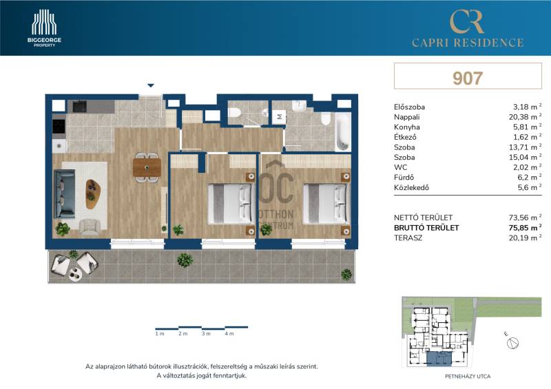 Projekt bemutatásaA Capri Residence a XIII. kerület szívében, a dinamikusan fejlődő Váci út közvetlen közelében valósul meg, amely Budapest egyik legkeresettebb lakáspiaci területe. Az elegáns, modern megjelenésű épületet, a homlokzatán végigfutó üvegkorlátos teraszok díszítik majd, a felsőbb szinteken pedig nagyteraszos lakások is elérhetők, amelyek egy része panorámás kilátást biztosít.Az épületben összesen 112 lakás kap helyet, amelyek elrendezése a stúdiótól a nappali plusz három hálószobásig terjednek. Az épületben emellett egy közösségi tér, 122 parkolóhely, 62 tároló, valamint opcionálisan elektromos autótöltővel szerelt teremgarázs beállók is megépítésre kerülnek.A műszaki felszereltség a legmagasabb szakmai trendeket követi: a Capri Residence lakóinak kényelmét mennyezeti hűtés-fűtés, háromrétegű üvegezéssel ellátott műanyag nyílászárók, smart-home előkészítés, valamint belsőépítész által összeállított belső anyagválaszték biztosítja majd. A földszinti lakásokhoz privát kertkapcsolat tartozik, emellett a társasház közös díszkerttel is rendelkezik.