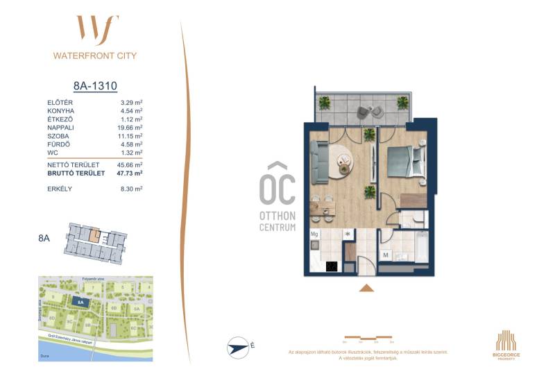 Projekt bemutatásaA projektrőlA Waterfront City egy új, modern városnegyed a 3. kerületben, ahol a természet közelsége és a városi kényelem tökéletes egyensúlyban van. A Duna-part közvetlen szomszédságában elhelyezkedő fejlesztés különleges atmoszférát kínál: a sétányt új épületek határolják, üzletekkel, kávézókkal és szolgáltatásokkal, amelyek élhető közösségi teret teremtenek.A 13 emeletes lakóépületből lenyűgöző örökpanoráma nyílik a budai hegyekre és a folyóra, a tágas teraszok pedig ideálisak a pihenéshez vagy a baráti összejövetelekhez. A zöldtetők, parkosított terek és fenntartható megoldások – mint az energiatakarékos rendszerek és okos otthon funkciók – mind hozzájárulnak a modern, környezettudatos életstílushoz.Látogass el értékesítési irodánkba, és tekintsd meg a városnegyed makettjét személyesen! Ismerd meg, milyen lesz az élet Budapest egyik legizgalmasabb új fejlesztésében!Óbuda szívébenKépzeld el, ahogy egy napsütéses délelőttön Óbuda szívében sétálsz, a Duna közelsége frissítően hat rád, miközben a Folyamőr utca, a Miklós tér és a Bogdáni út által határolt, öt hektáros területre érsz. A levegőben ott van a város történelme, mégis minden részletében a jövő hívogat.A 50 000 négyzetméteres területen egy hangulatos sétány vezet végig, amely egyenesen az óbudai Fő térre visz – mindössze 600 méterre. Ez a sétány nem csupán összeköt, hanem élményt nyújt: a Kolosy térről induló Óbudai Promenád részeként a város egyik legélhetőbb, legpezsgőbb szakaszán haladsz végig. És ha biciklivel érkeznél? A nemzetközi kerékpárút is itt halad el, Szentendre felé vezetve.Az 5. ütemben épülő 149 lakás mindegyike egyedi hangulatot kínál. Ahogy belépsz egy-egy otthonba, a hatalmas üvegfelületeken át beáradó fény és a tágas, szellős terek azonnal magukkal ragadnak. A kilátás? A Kaszap István park zöldje nyújt békét, míg a felsőbb emeletekről a Budai-hegység örökpanorámája tárul eléd – minden nap egy új festmény az ablakodban.A 6. ütemben 316 modern lakás épül, tágas teraszokkal és lenyűgöző kilátással a Dunára és a budai hegyekre. A lakók kényelmét őrszolgálat, kamerarendszer, mélygarázs, vendéglátóhelyek, belső park, játszótér és E-autó töltők szolgálják. Ez a projekt utolsó üteme, amely még közvetlen Duna-parti kapcsolattal rendelkezik.